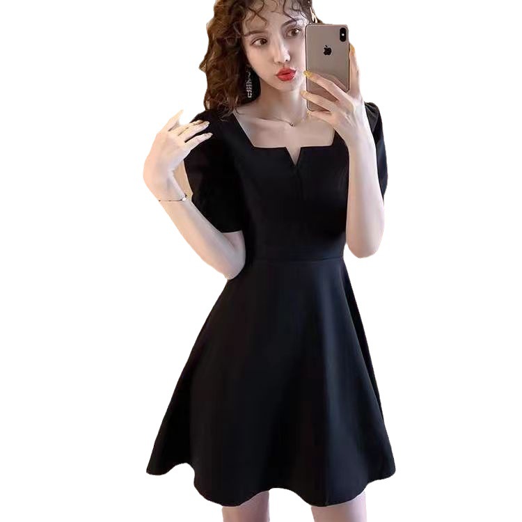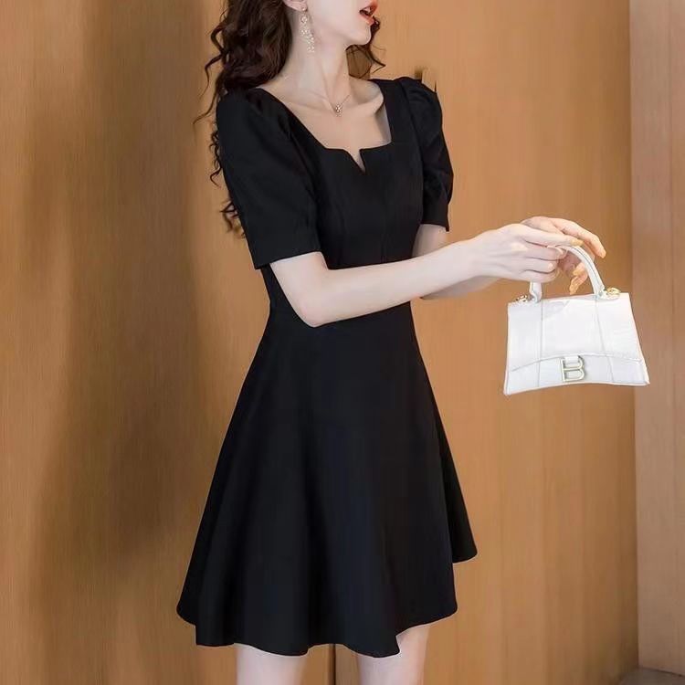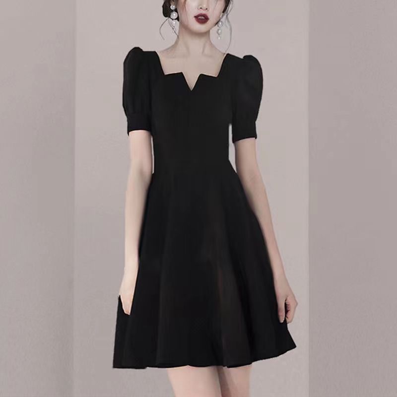 短袖连衣裙女夏季新款法式小礼服赫本风收腰泡泡袖a字小黑裙