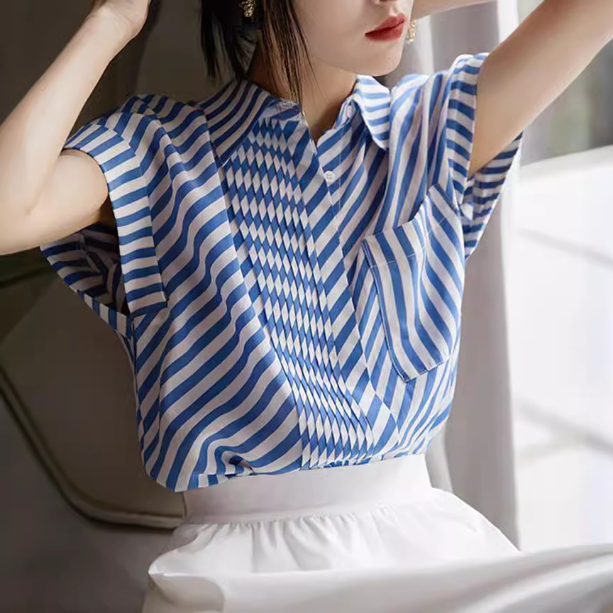 真丝手工缝线压折不对称微盖袖条纹女夏季百搭条纹衬衫气质上衣