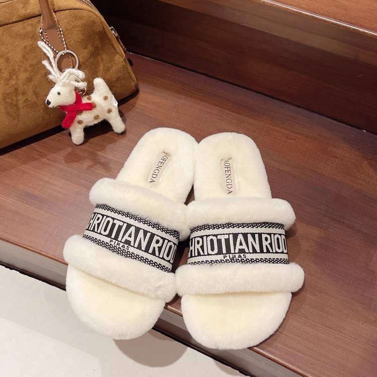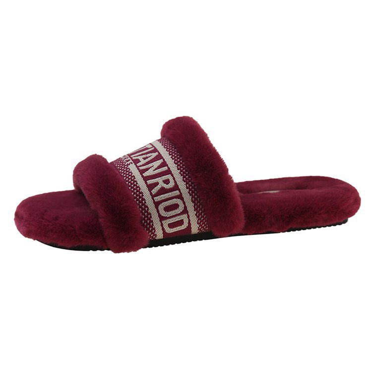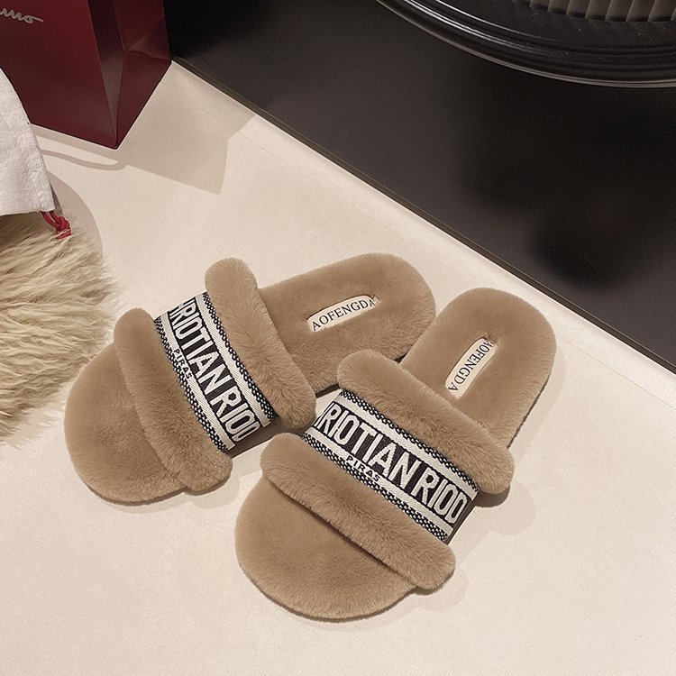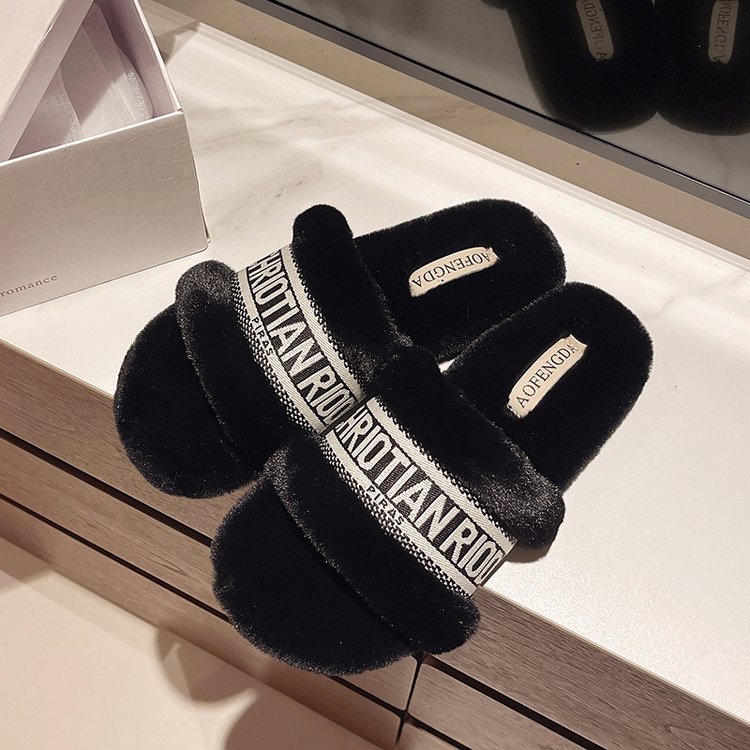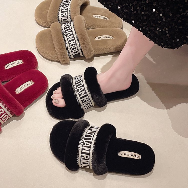 小香风毛毛拖鞋女时尚外穿年秋冬季新款平底刺绣字母一字棉拖