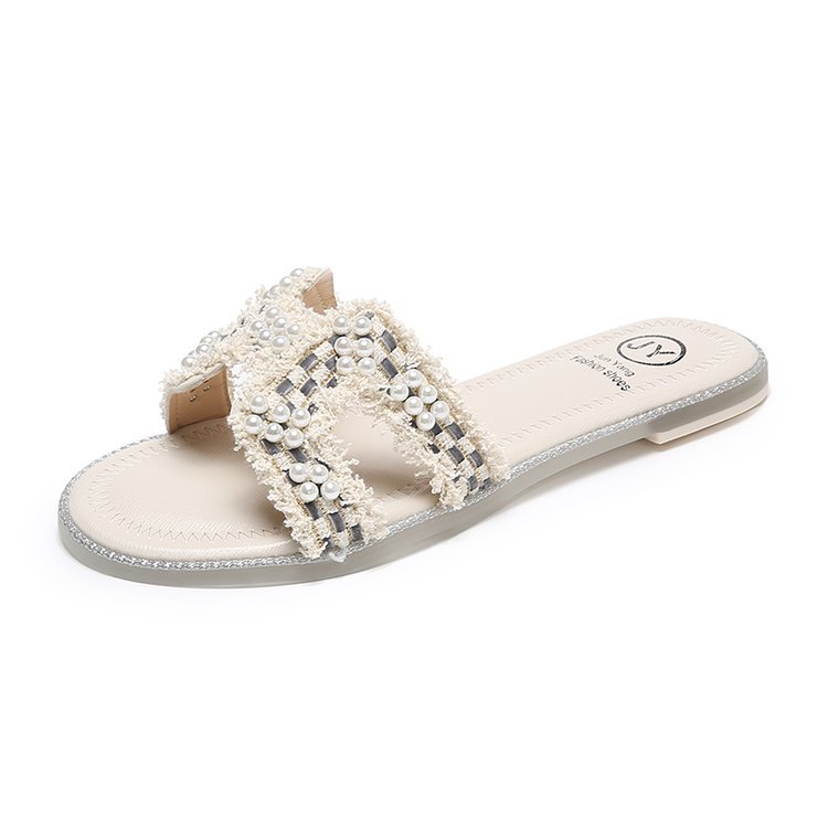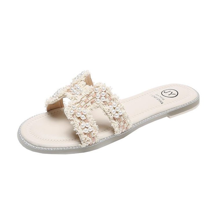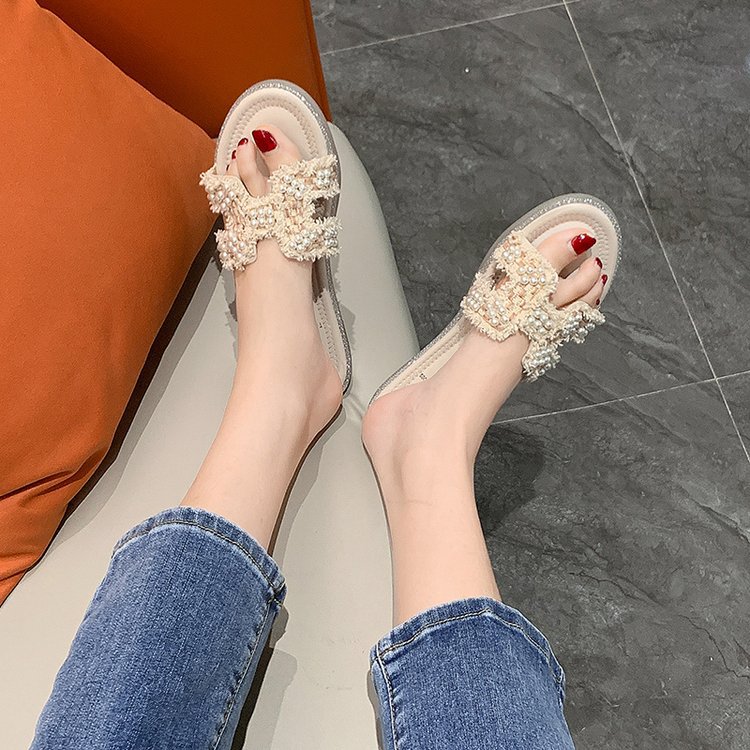 网红小香风珍珠拖鞋女夏外穿薄底一字拖软底舒适沙滩懒人凉拖
