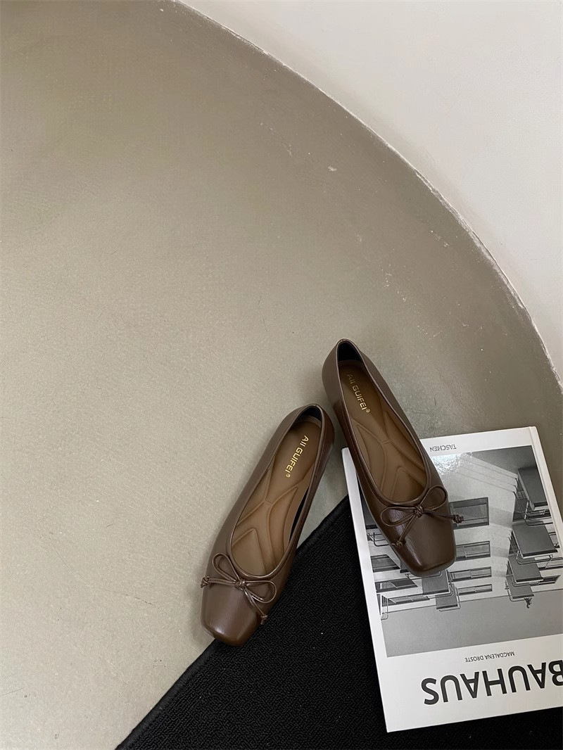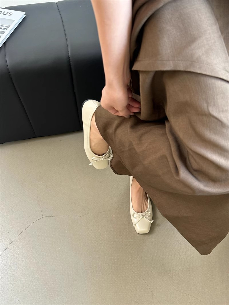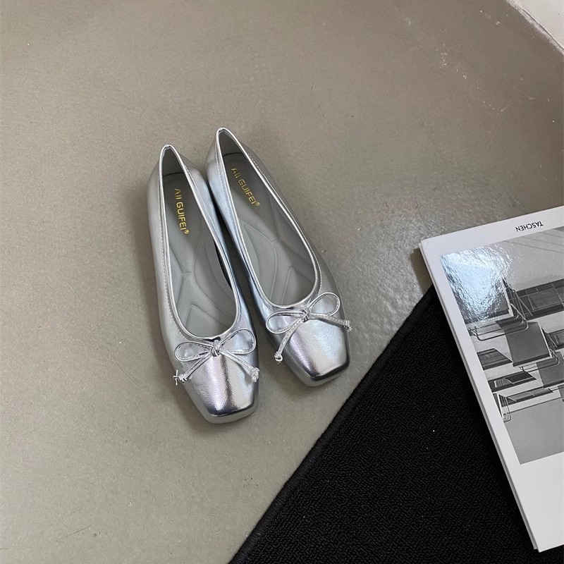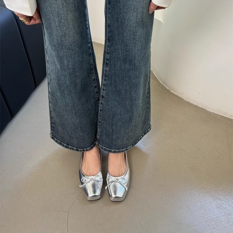 法式仙女风浅口单鞋女夏新款银色蝴蝶结平底仙女风方头豆豆鞋
