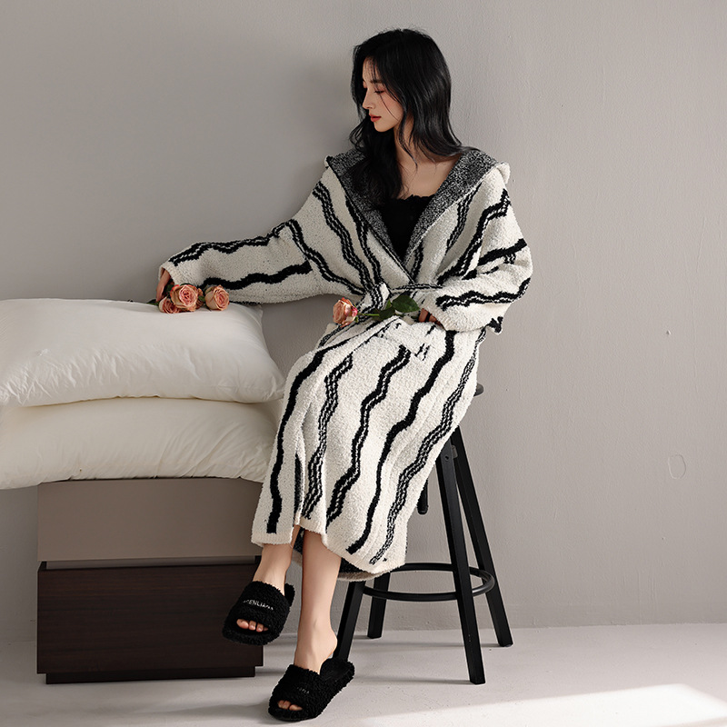 软绵绵半边绒睡衣秋冬女士睡袍长款加厚连帽家居服浴袍珊瑚绒