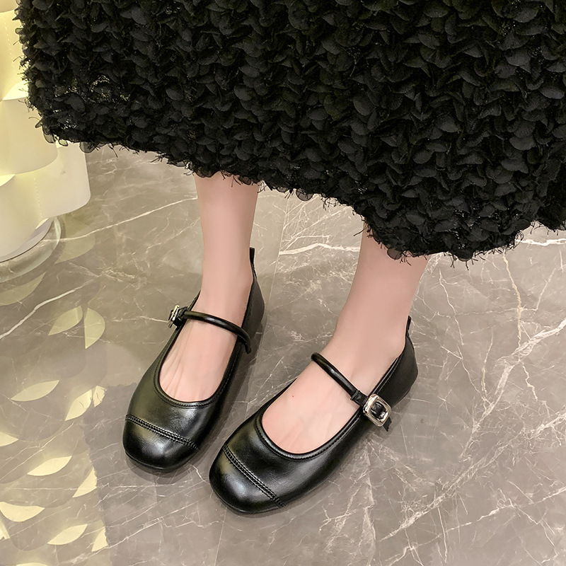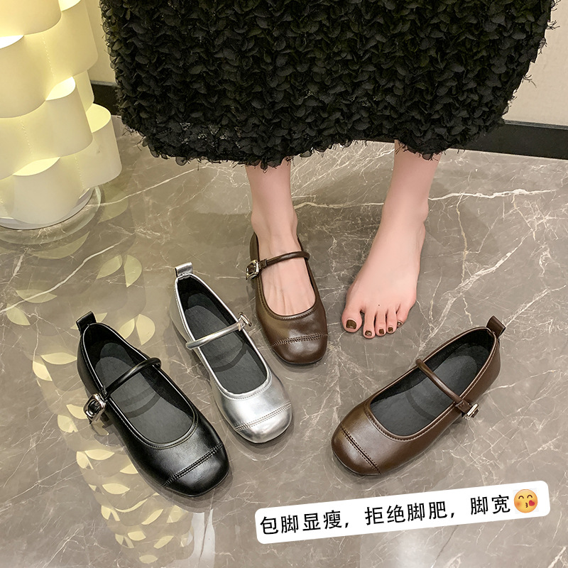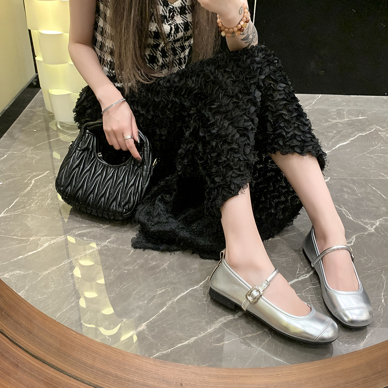 方头浅口百搭平底银色玛丽珍单鞋女新款夏季法式配裙子小皮鞋