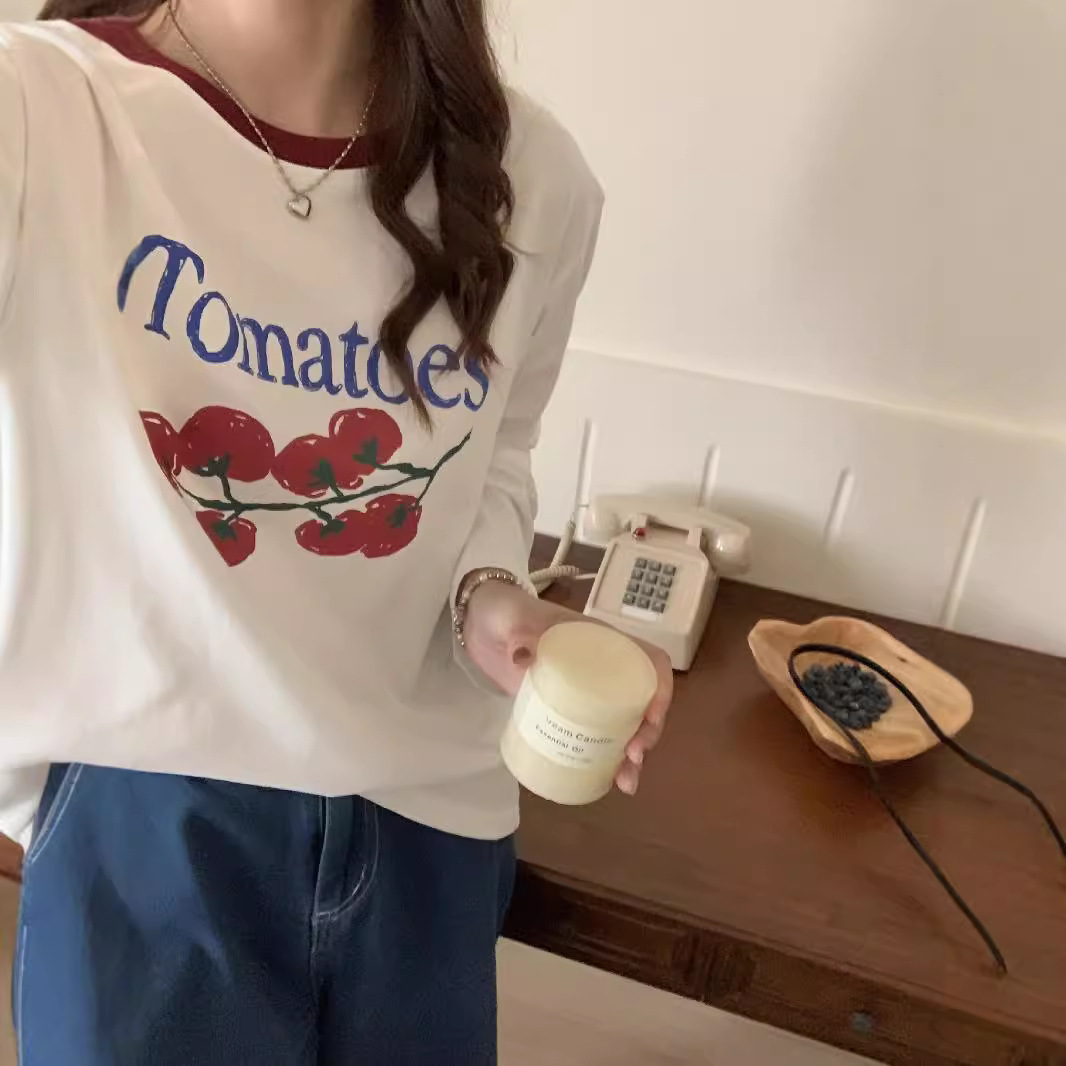 纯棉减龄字母印花拼色长袖t恤女早秋新款全棉打底衫宽松上衣