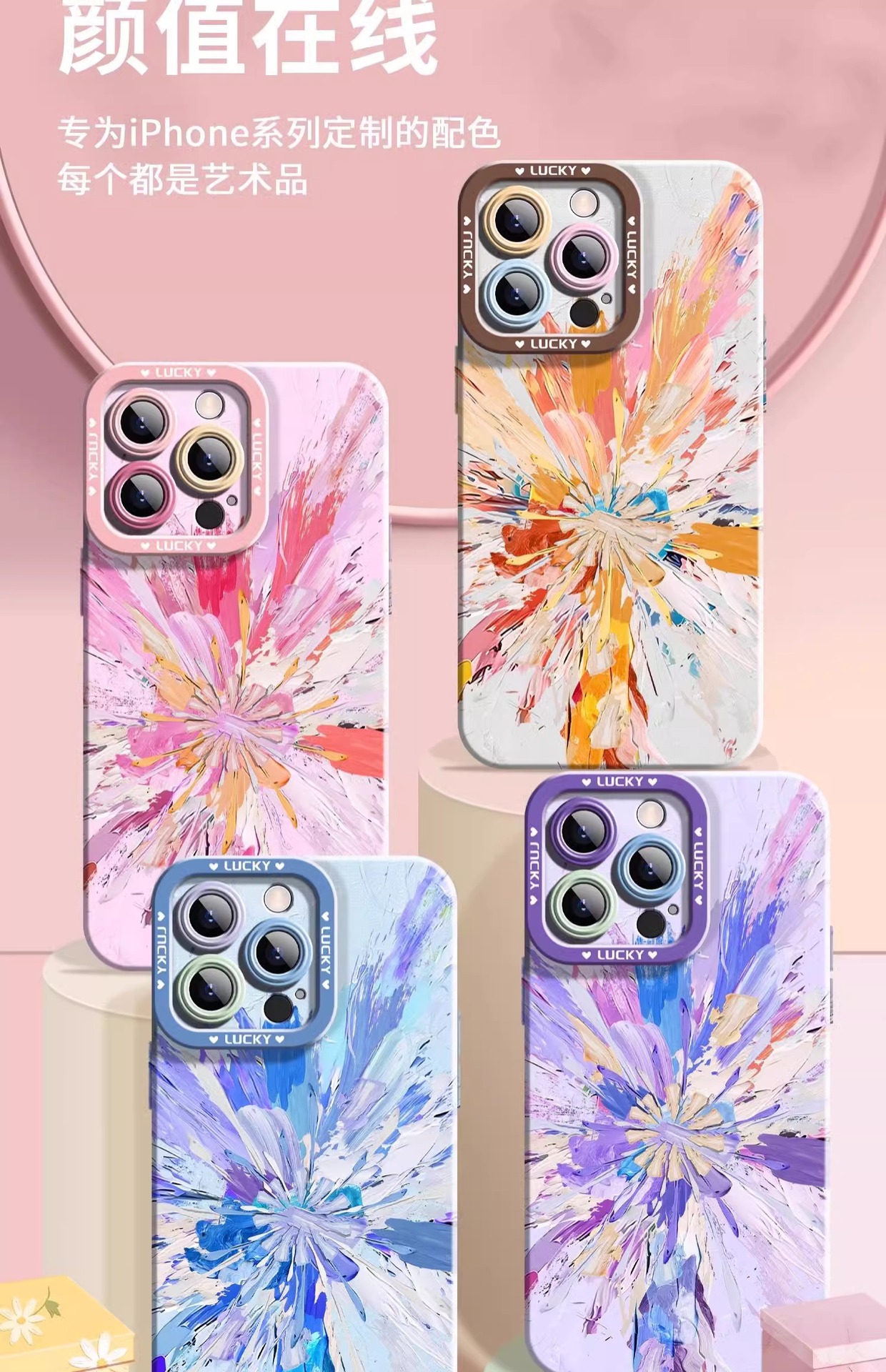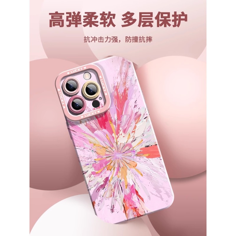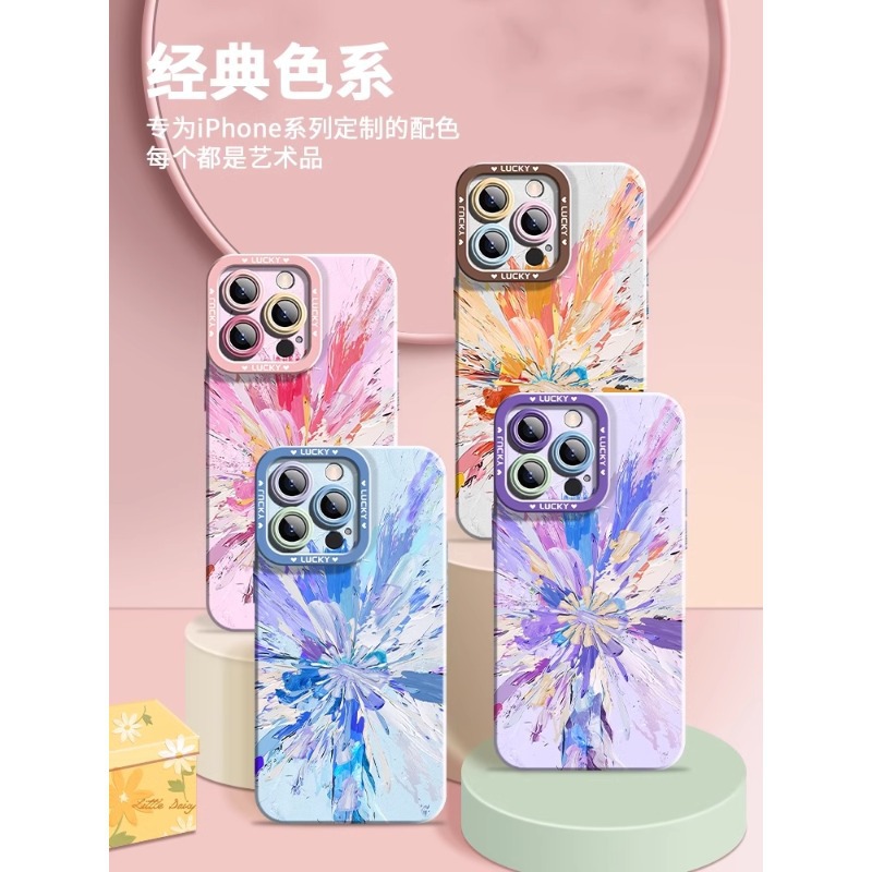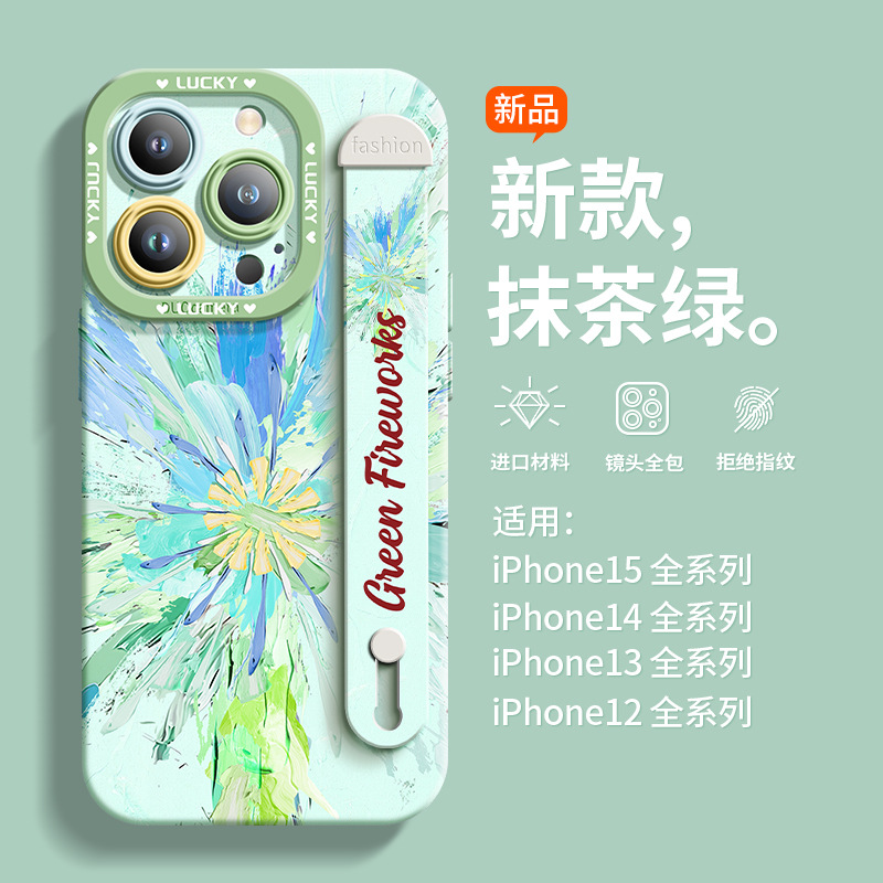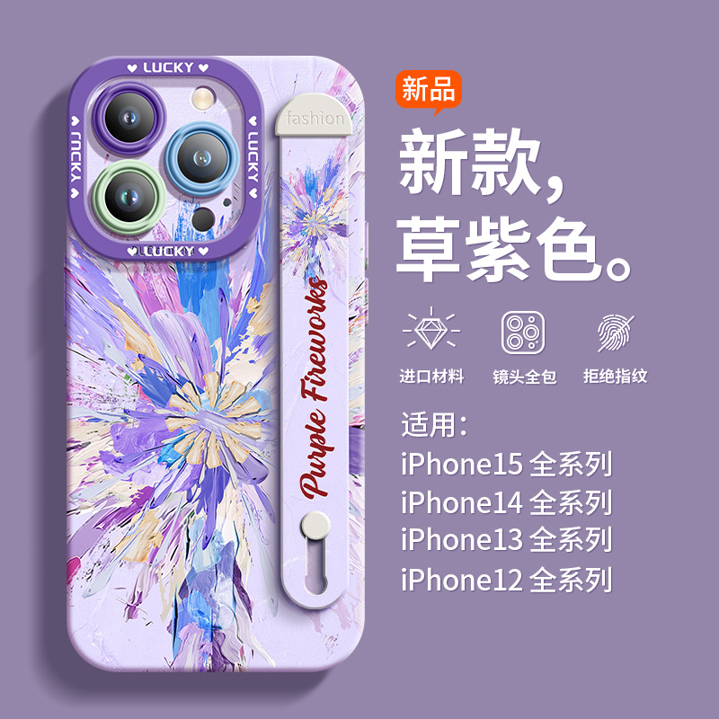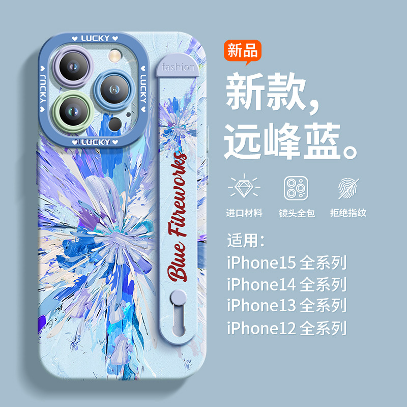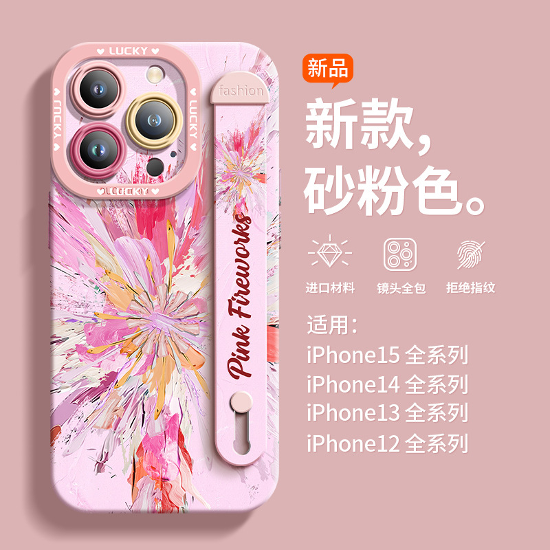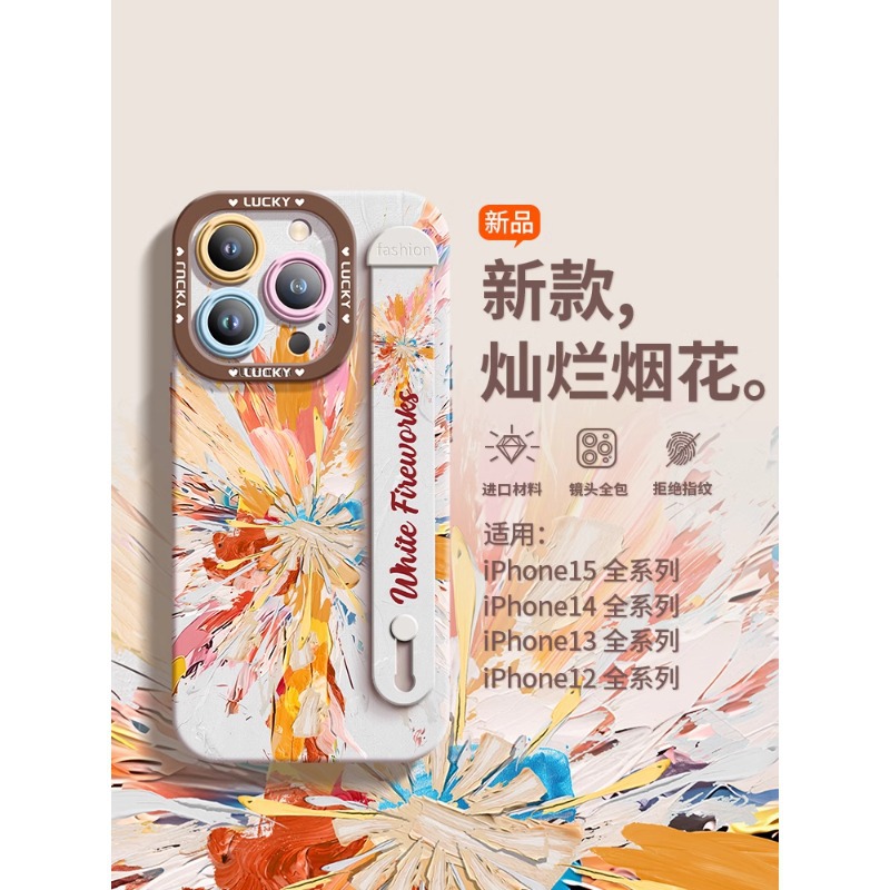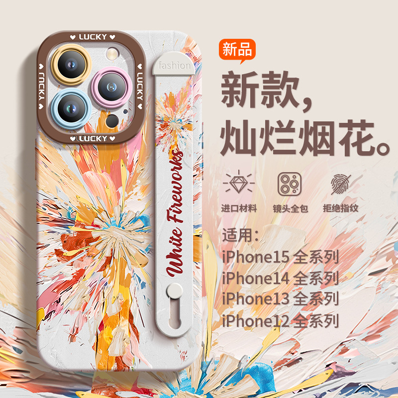 适用于苹果14puls手机壳液态油画烟火硅胶15男女全包iPhone13腕带