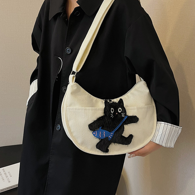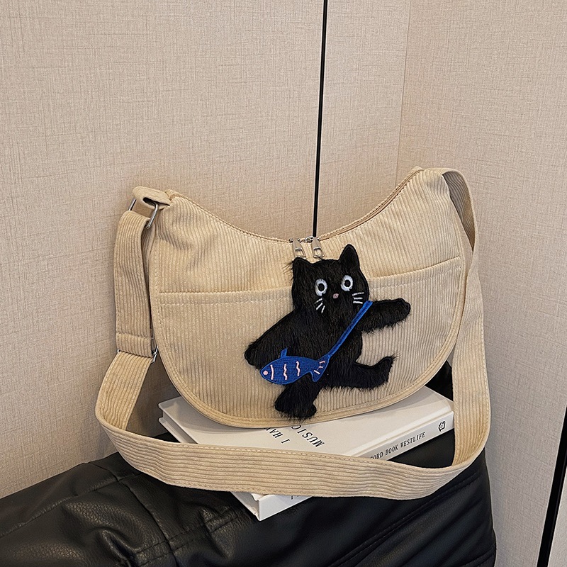 卡通猫咪少女学生斜挎包可爱软妹灯芯绒包包女简约百搭休闲饺子包