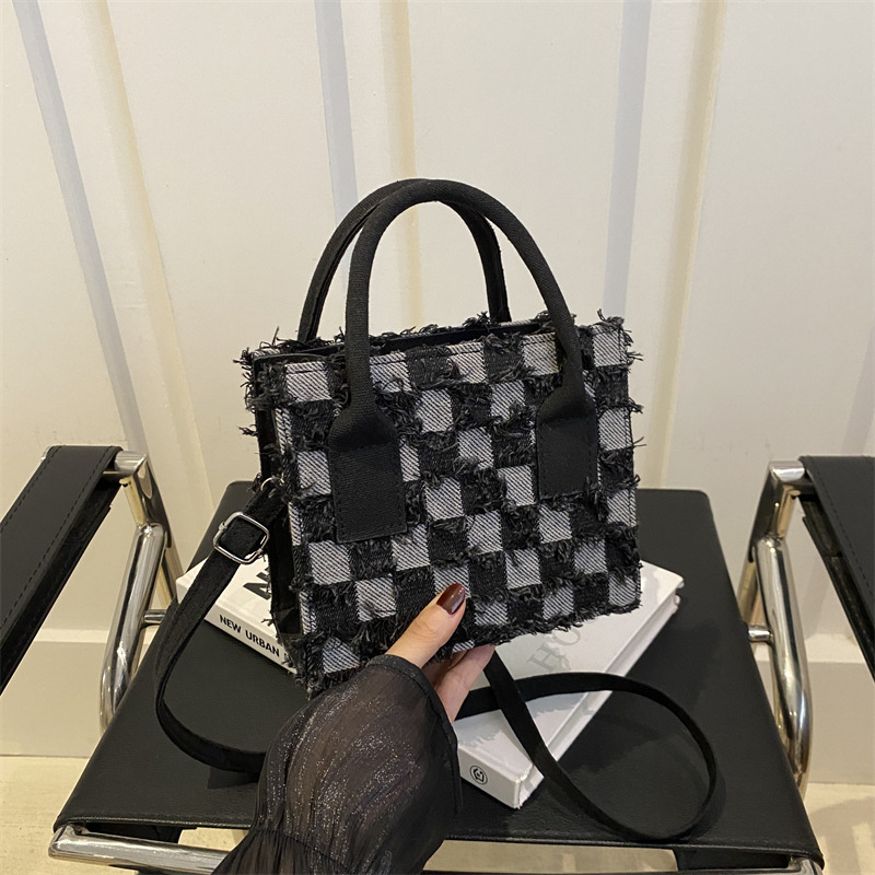 新款牛仔帆布包棋盘格女包小众时尚潮高级感百搭手提小方包斜挎包