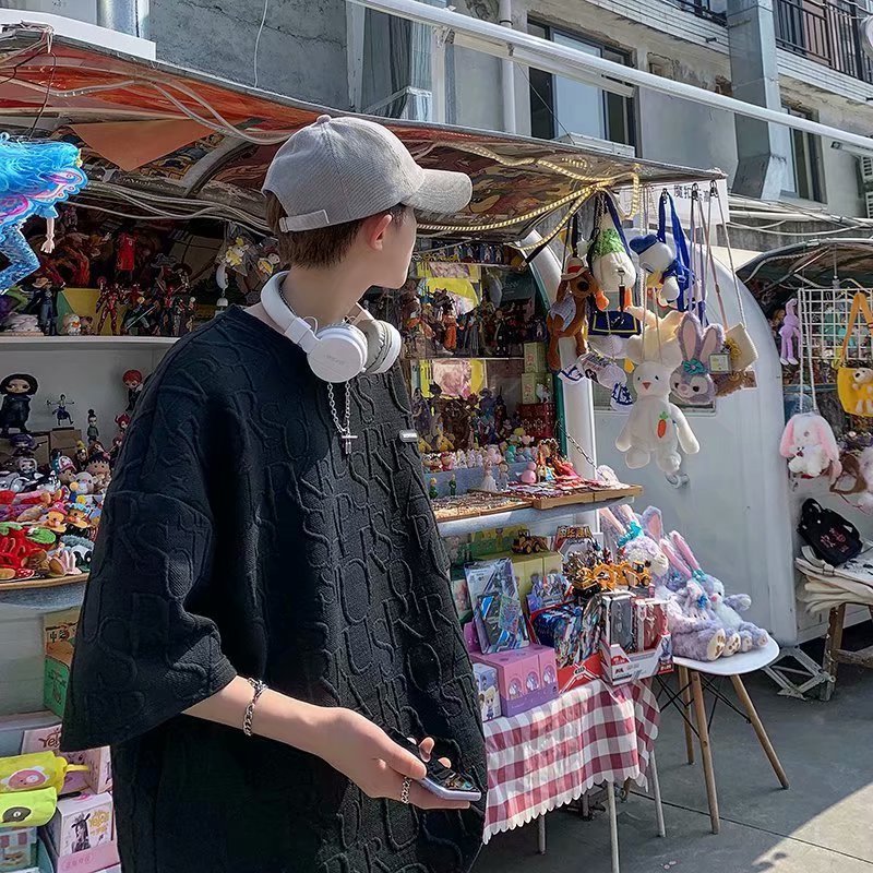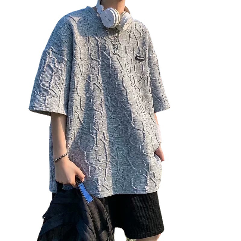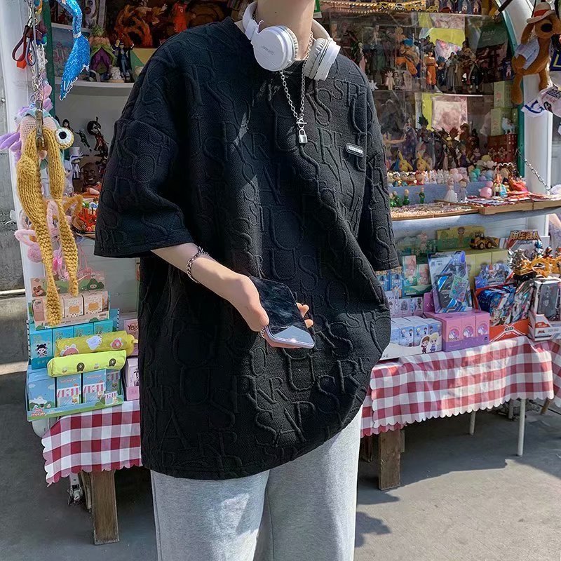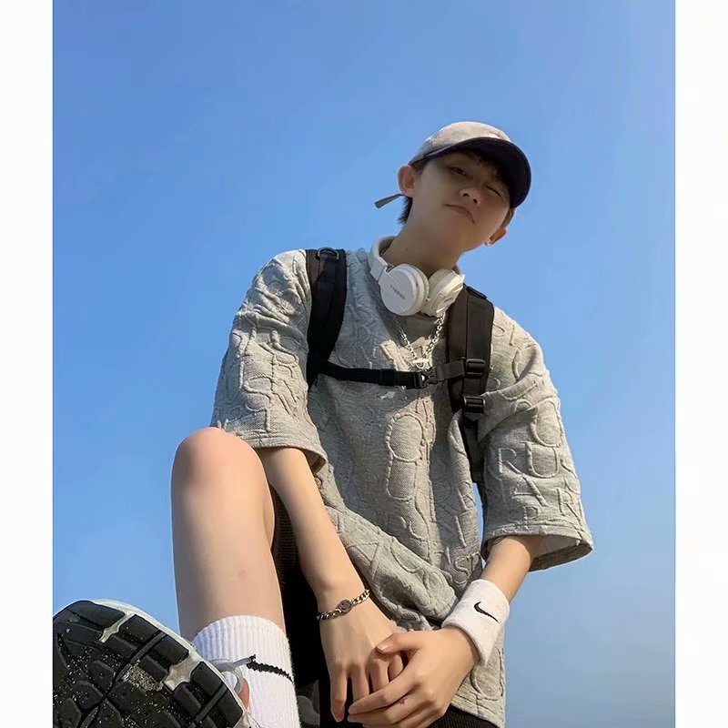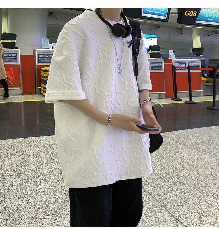 新款男士体恤压印短袖T恤ins潮流牌宽松百搭原宿夏季五分袖半袖男