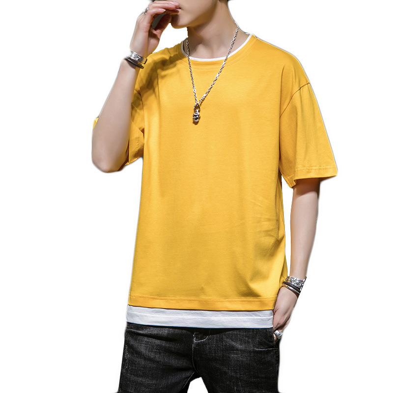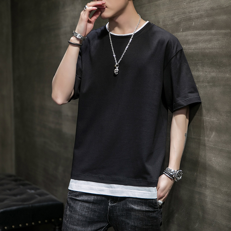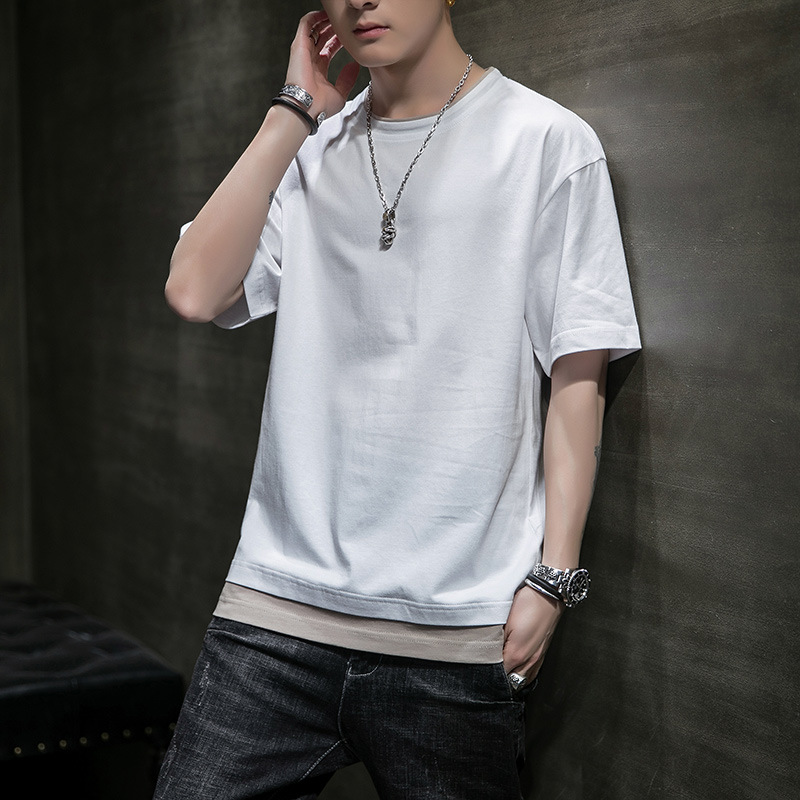 男士短袖t恤夏季潮流纯棉纯色拼接半袖T恤新款圆领宽松打底上衣男