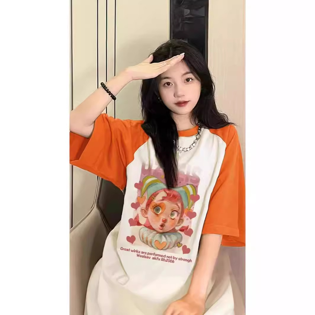 夏日多巴胺穿搭设计感纯棉短袖T恤女插肩拼色独特别致潮牌上衣服