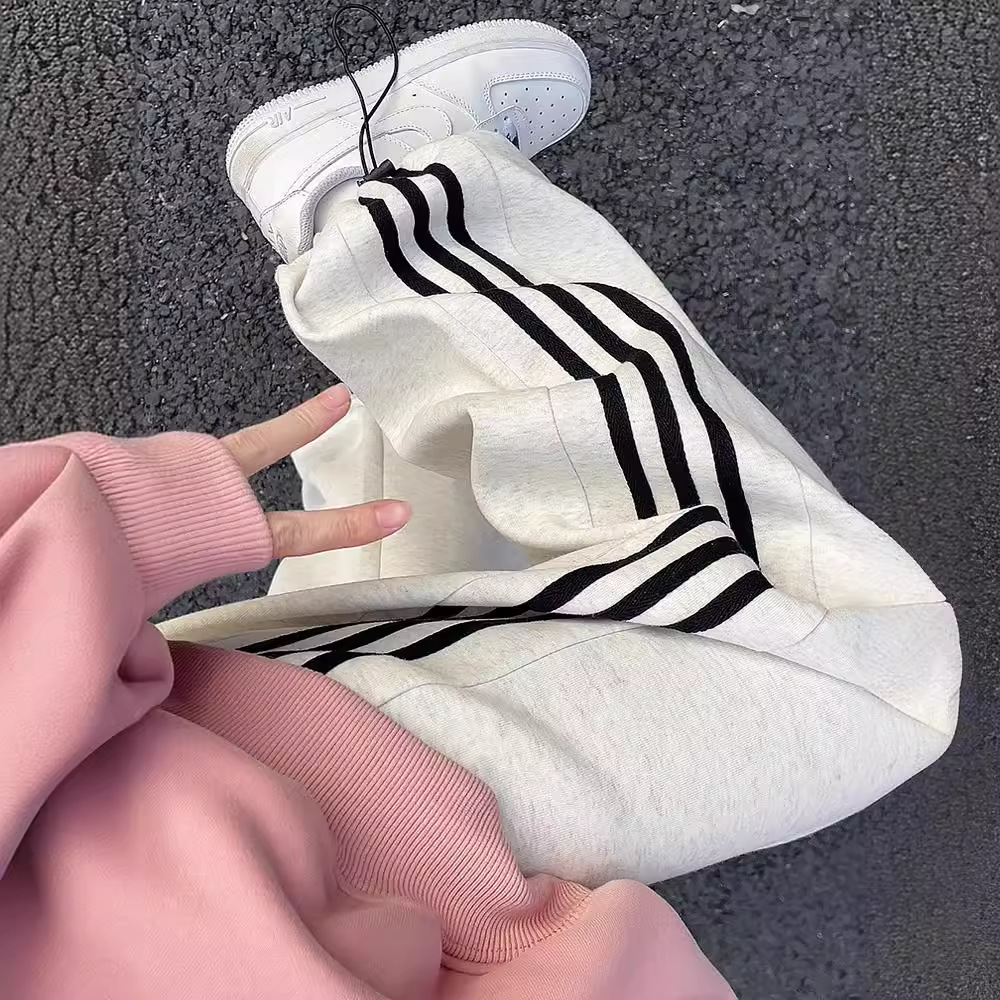 灰色美式卫裤女春秋新款高腰宽松休闲直筒阔腿条纹束脚运动裤