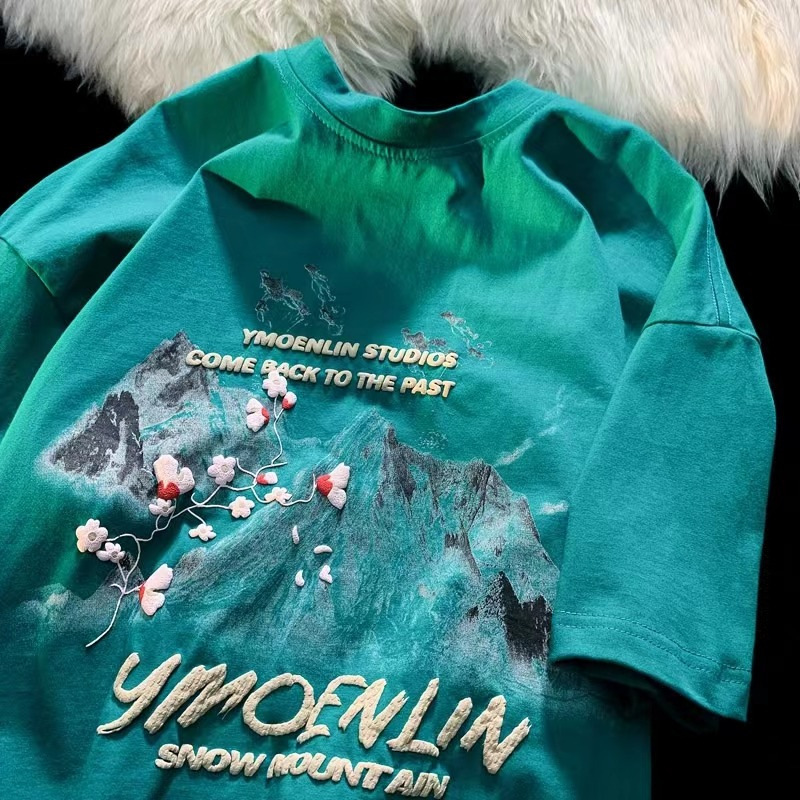国潮风梅花水墨发泡印花短袖T恤男女ins潮牌宽松oversize半袖上衣