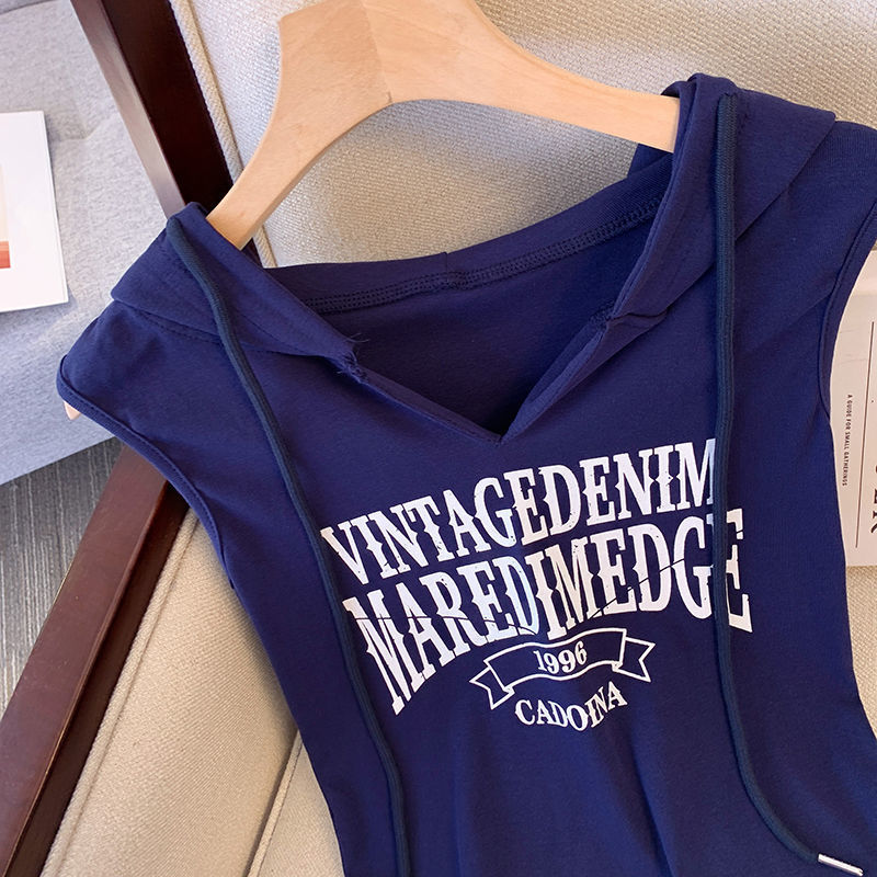 复古字母印花背心吊带女夏季新款连帽无袖运动上衣