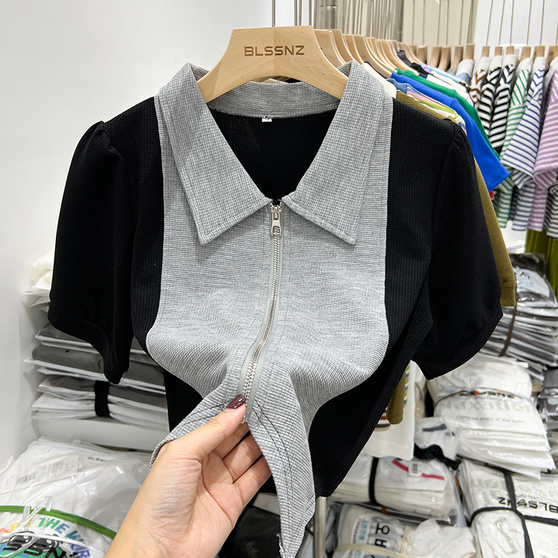 华夫格polo领短款上衣设计感小众拼接短袖t恤女显瘦百搭