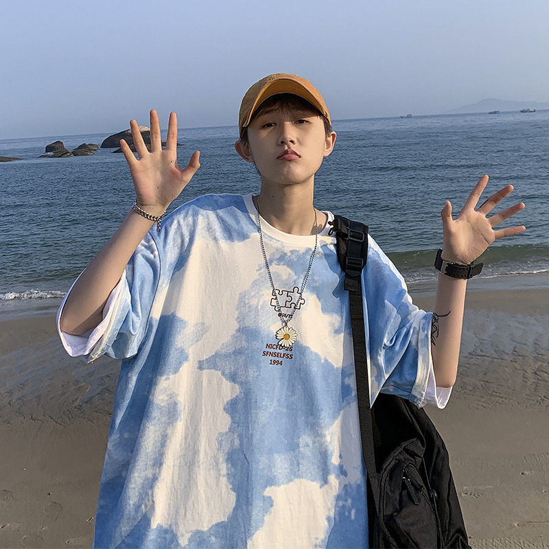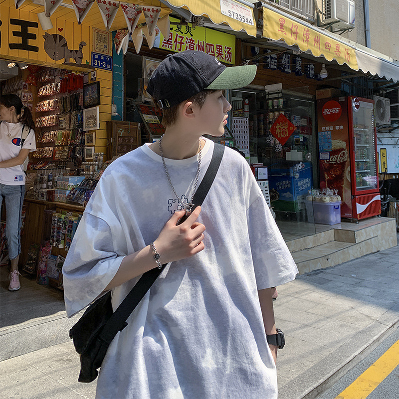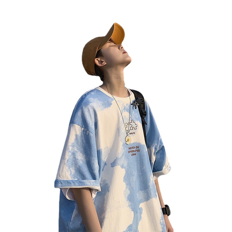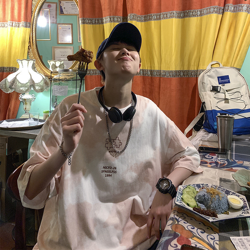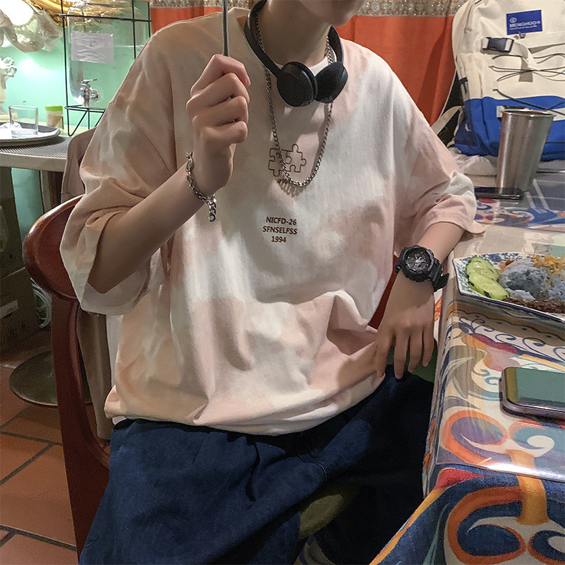 扎染短袖男t恤潮牌夏装ins港风宽松情侣五分袖潮流原宿风上衣