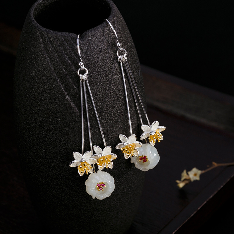 S925纯银和田玉梅花耳坠复古个性文艺女士耳环流苏耳钉节日礼物