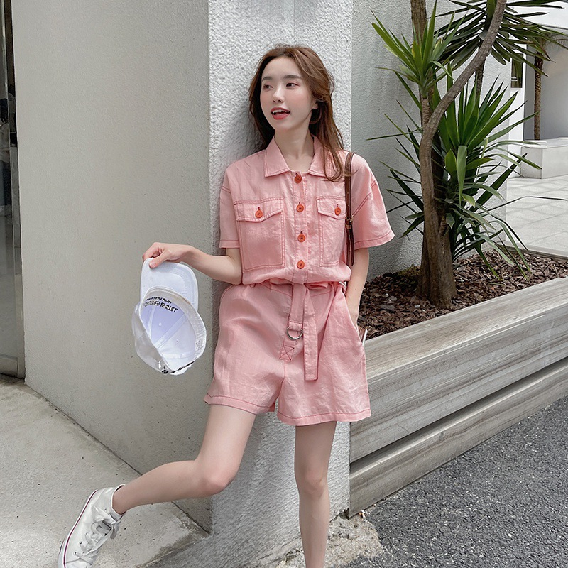 粉色连体裤夏女新款小个子套装工装薄款连衣裤阔腿短裤连体衣