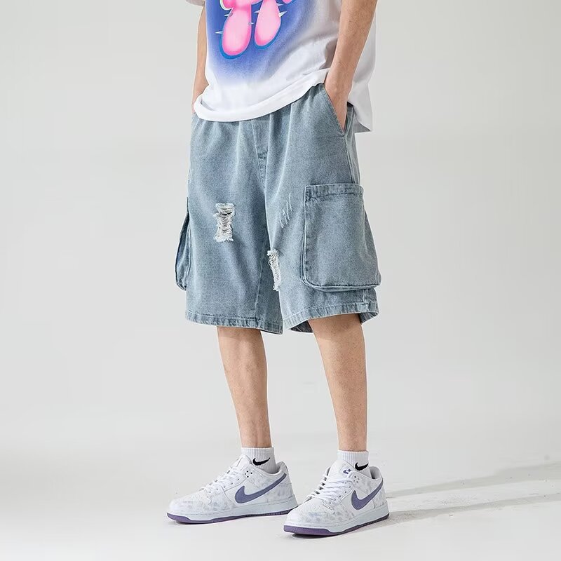 水洗工装牛仔短裤男夏季薄款中裤美式街头百搭宽松直筒运动五分裤