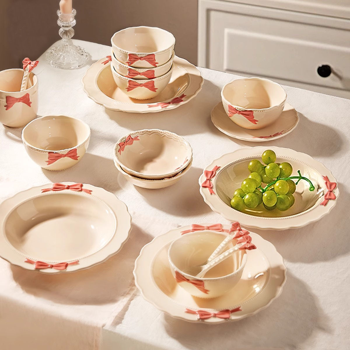 奶油风蝴蝶结碗碟餐具家用2025新款高颜值陶瓷饭碗汤碗面碗盘子碗