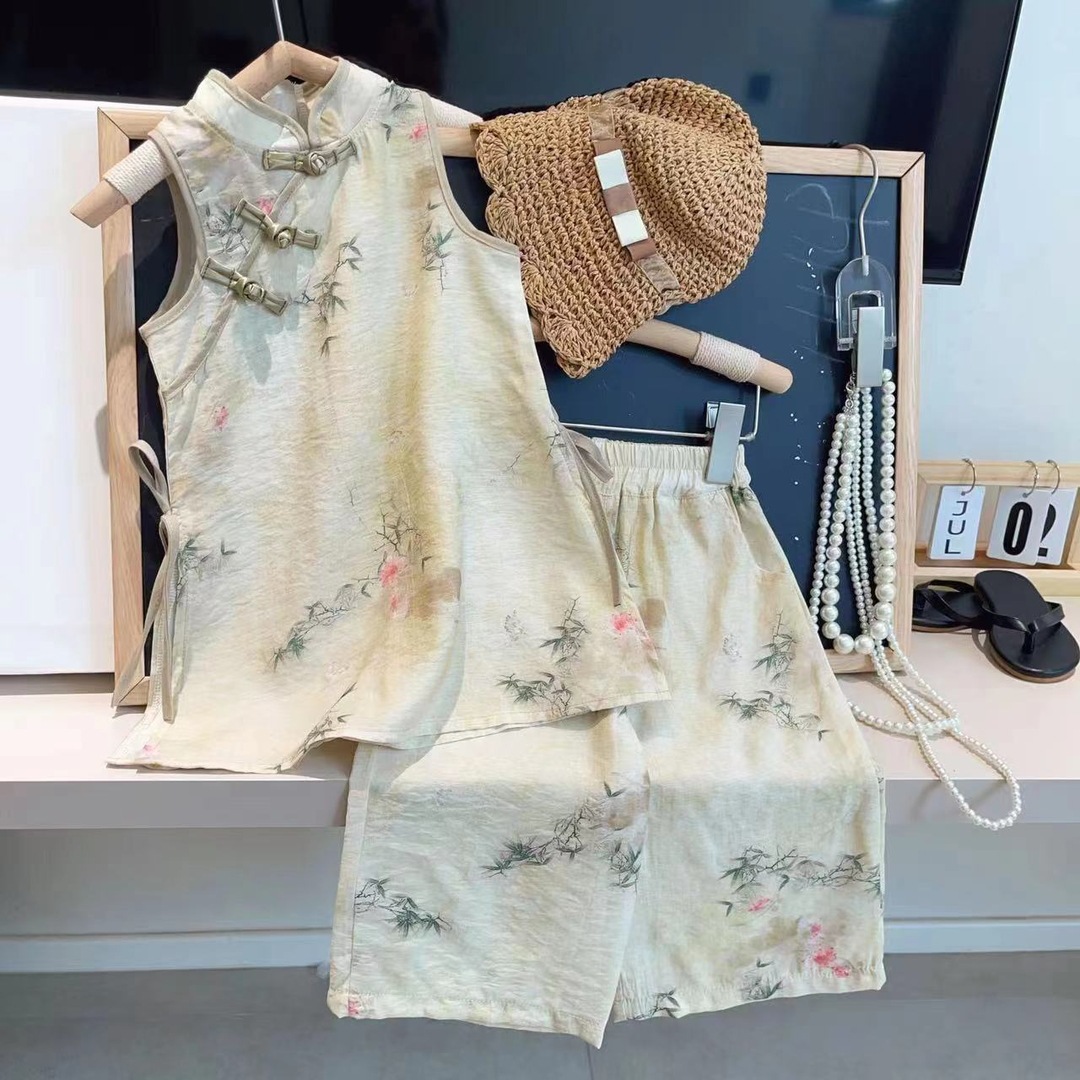 新品童装女童套装2025夏季盘扣无袖旗袍直筒裤宝宝两件套