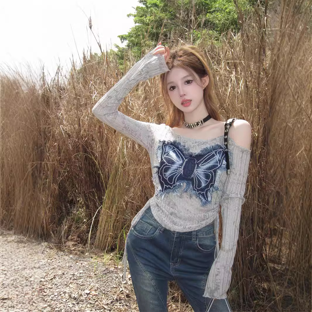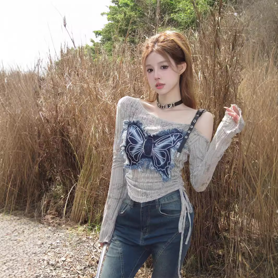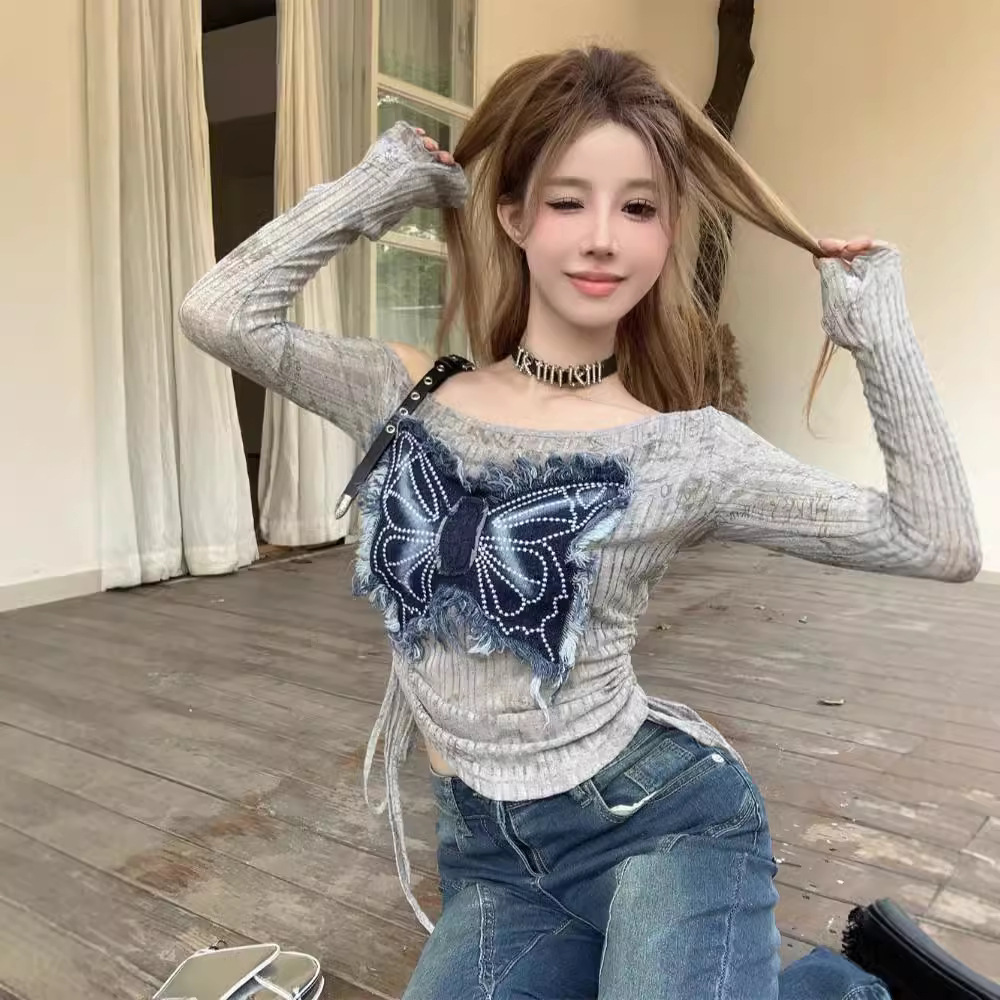 秋季独特别致美式复古y2k辣妹牛仔拼接蝴蝶露肩长袖上衣打底衫女