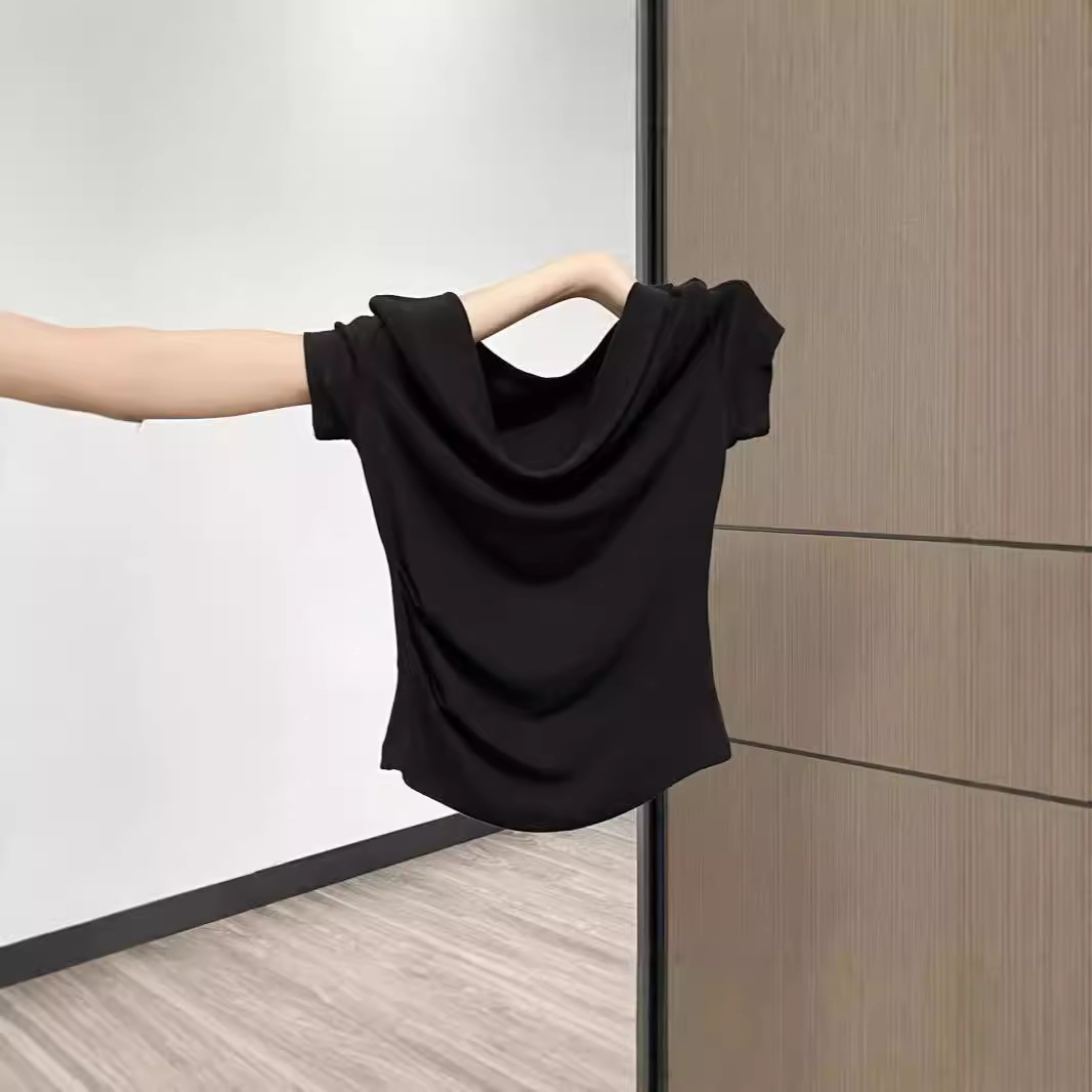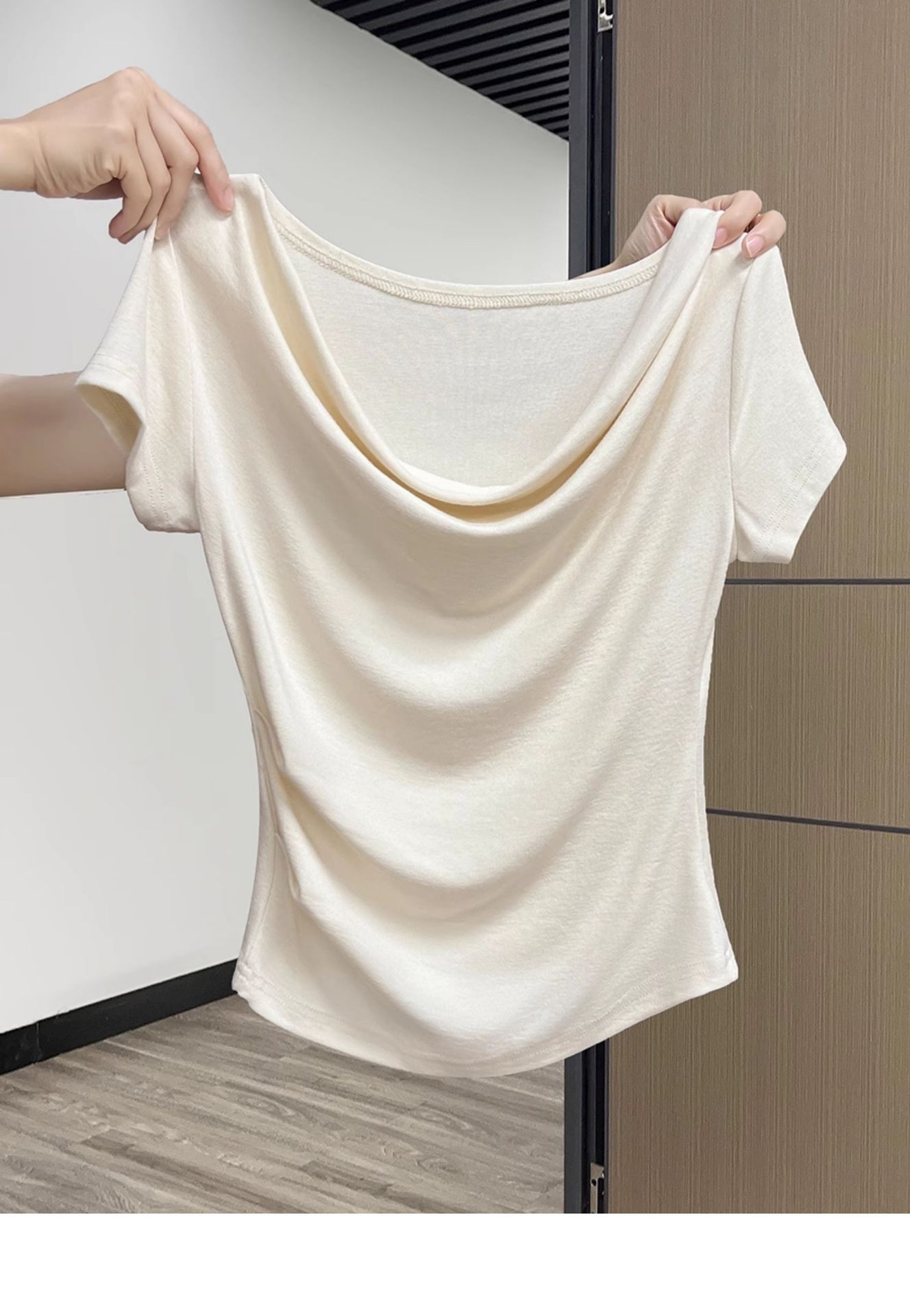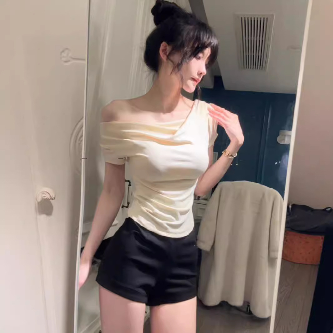 法式一字肩短袖T恤女夏季甜辣小众设计感褶皱修身收腰绝美小上衣
