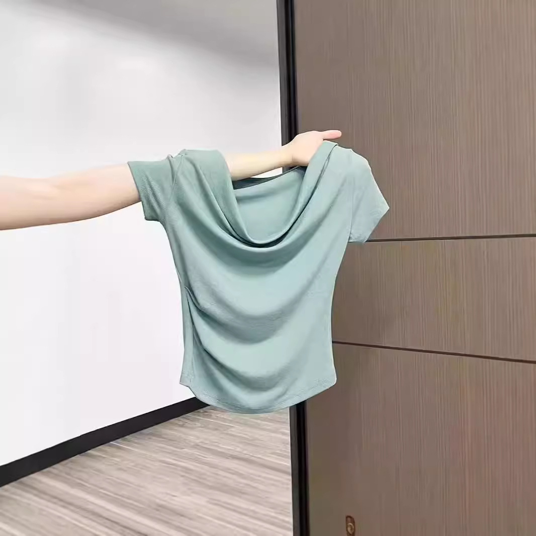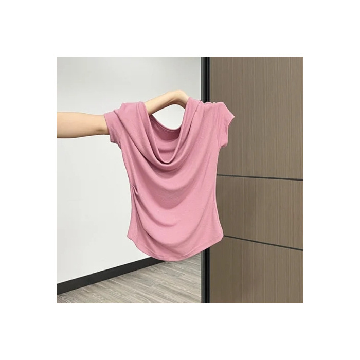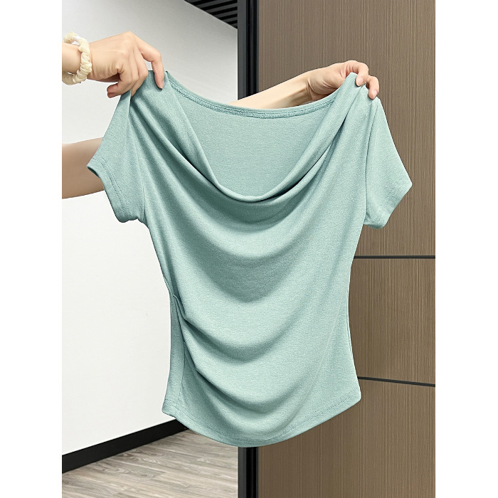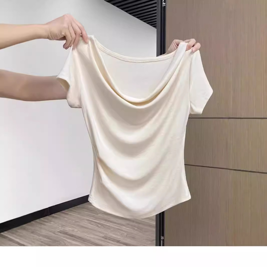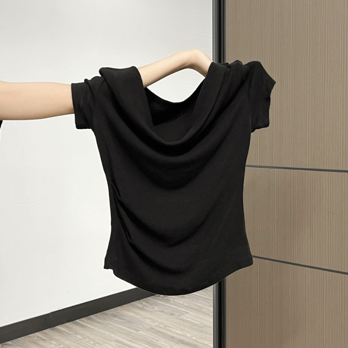 法式一字肩短袖T恤女夏季甜辣小众设计感褶皱修身收腰绝美小上衣