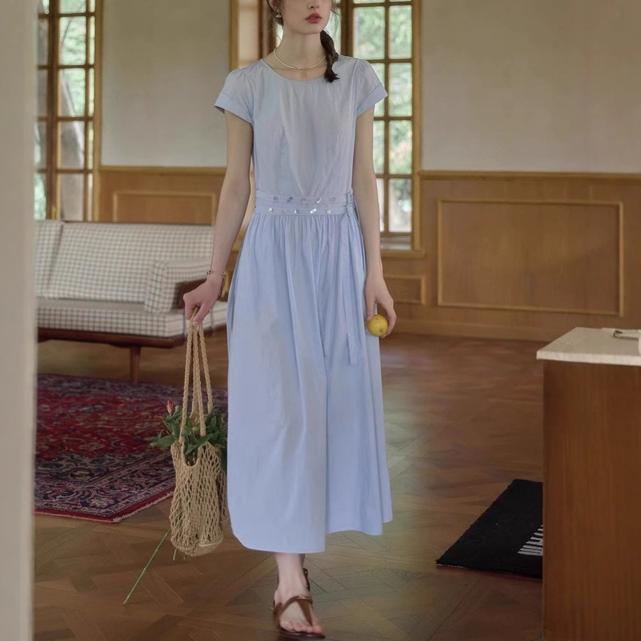 通勤蓝色腰部裙简约短袖连衣裙女夏日感a字裙