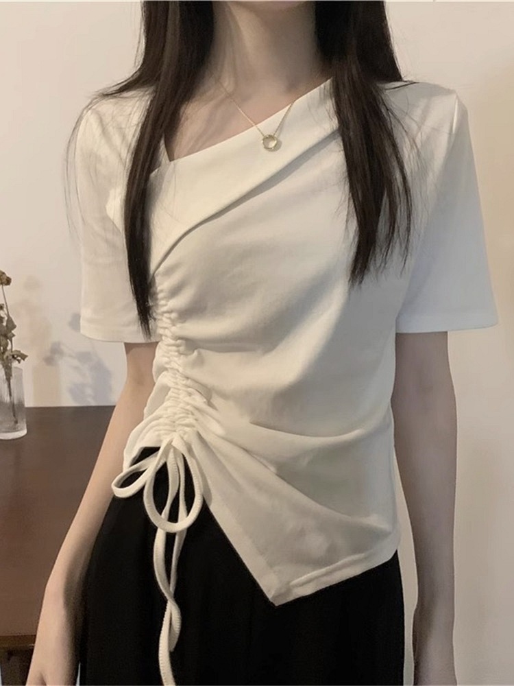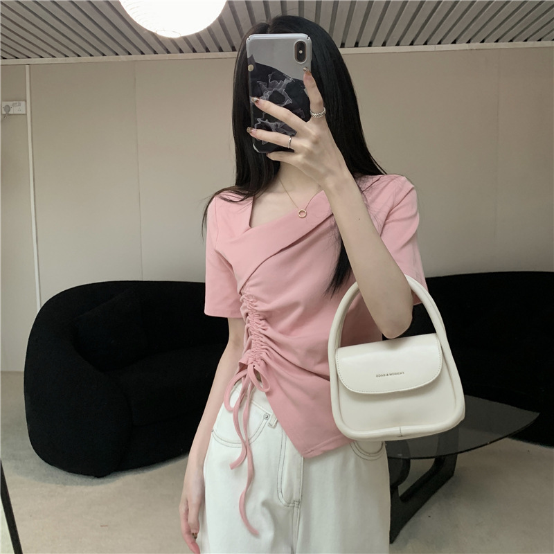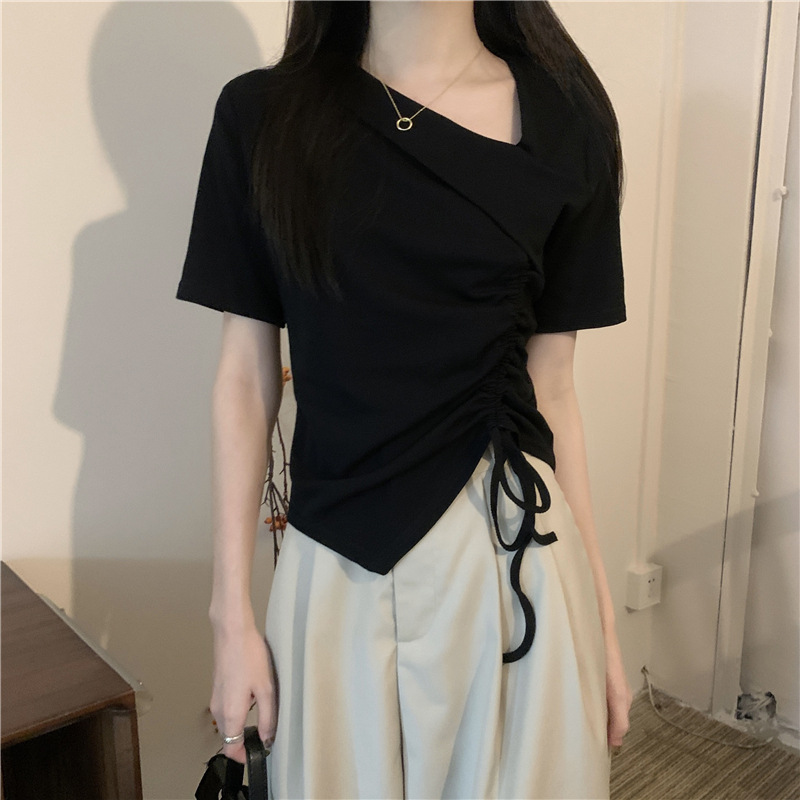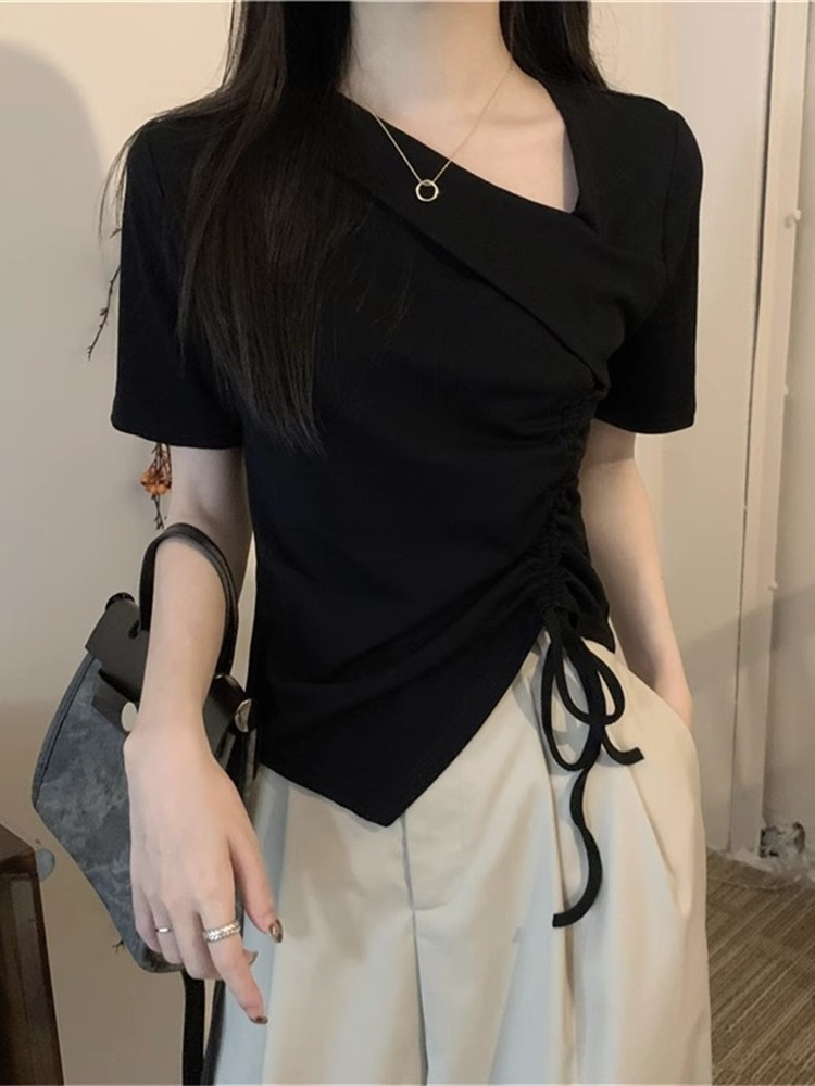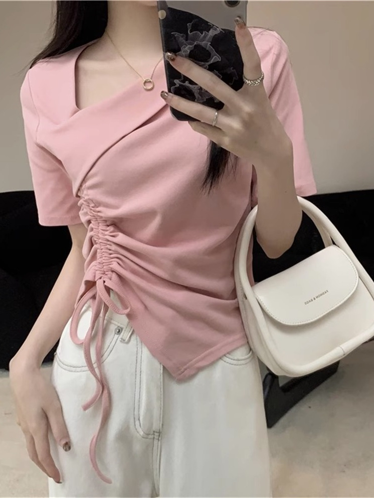 不规则抽绳短袖T恤女夏季新款设计感美式辣妹V领正肩短款上衣