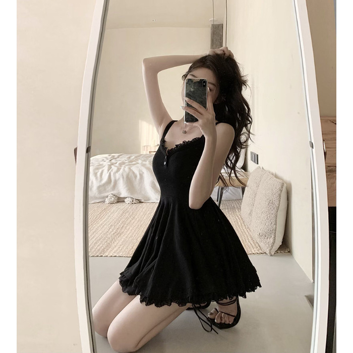 纯欲性感蕾丝拼接吊带连衣裙女夏季新款收腰显瘦气质百褶A字短裙