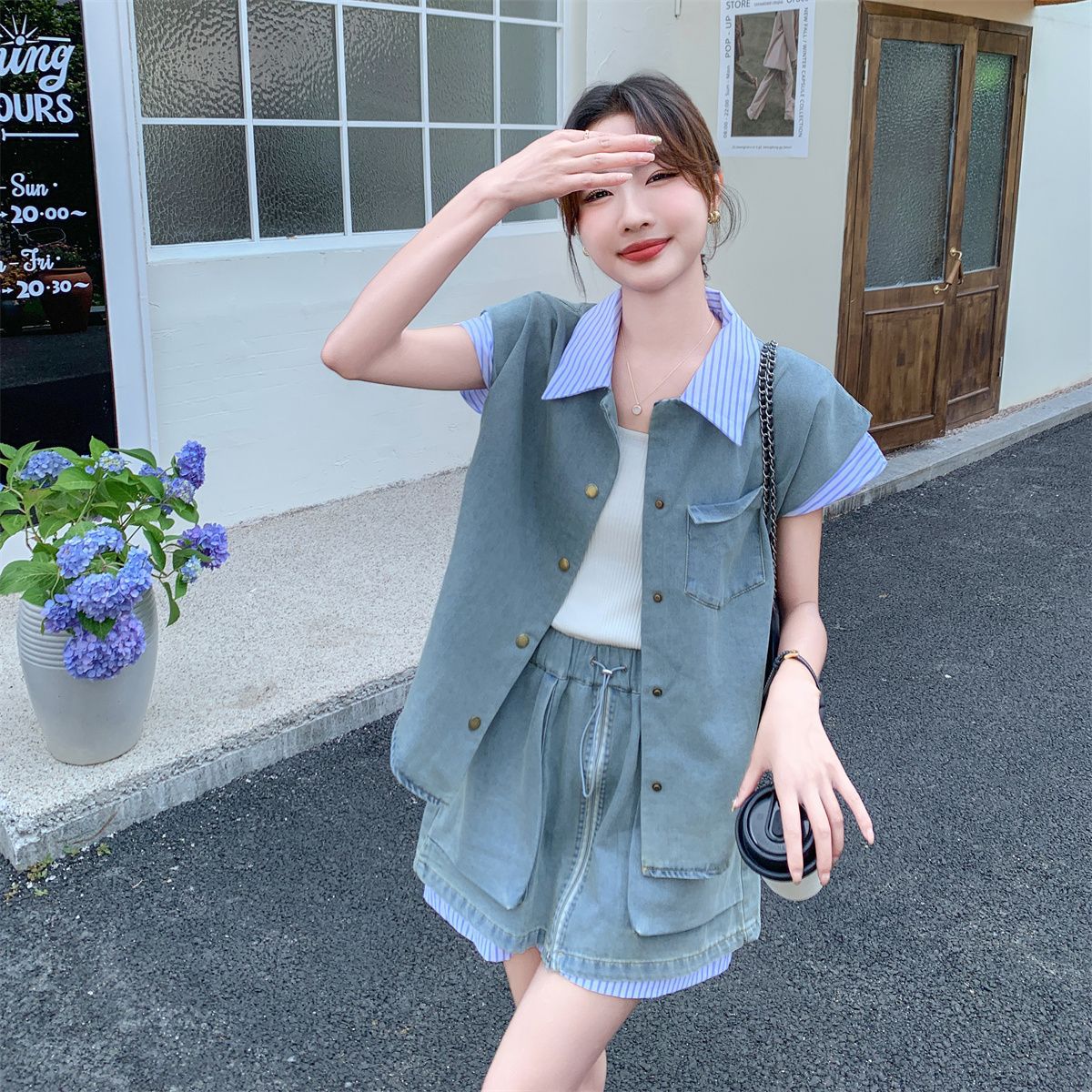 盐系假两件牛仔拼接衬衫短裤套装两件套女夏季时尚洋气减龄小个子