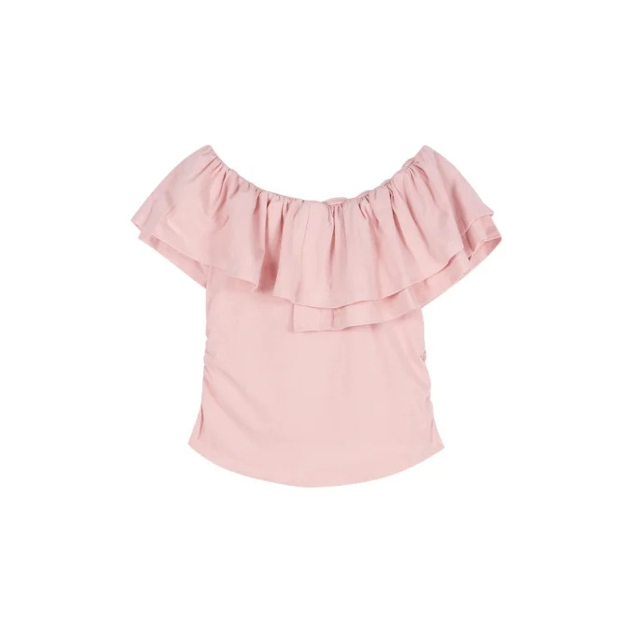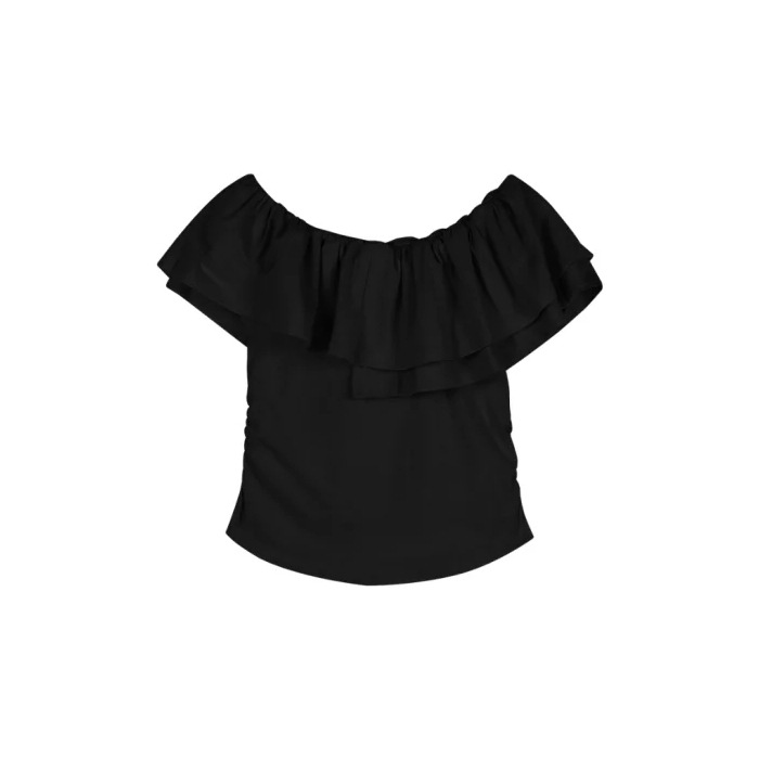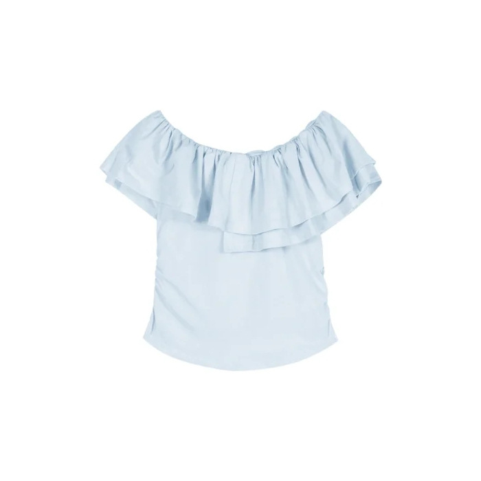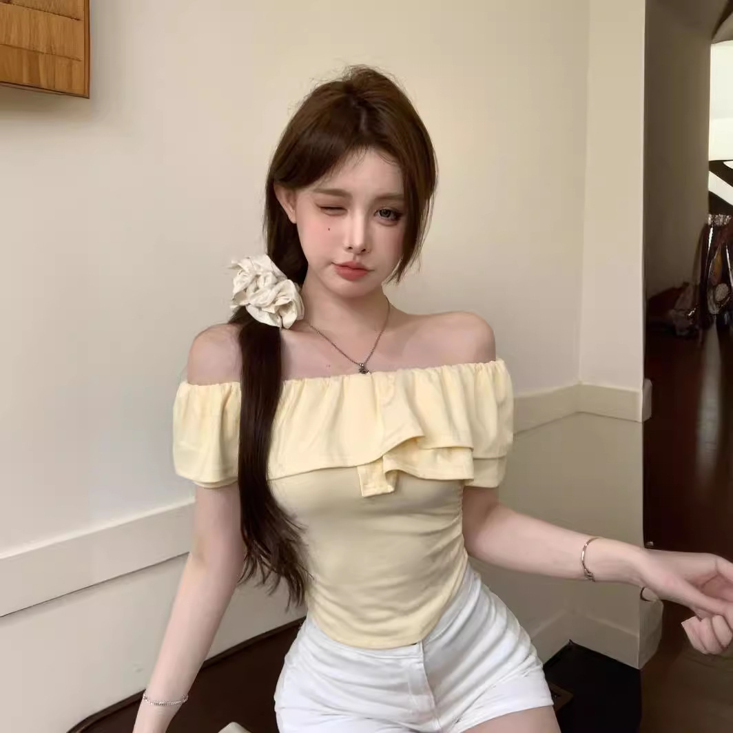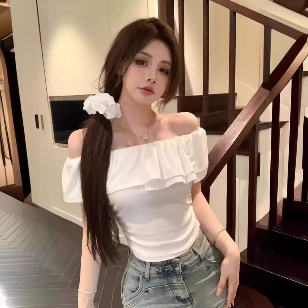一字肩性感纯欲短袖T恤女夏季修身褶皱荷叶边蓝色短款别致小上衣