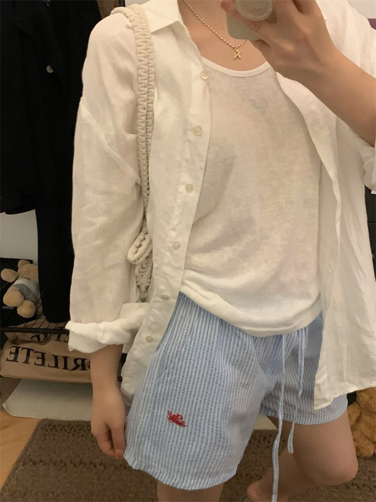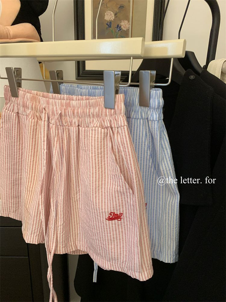 竖条纹抽绳字母刺绣阔腿短裤女夏季新款宽松薄款百搭休闲热裤