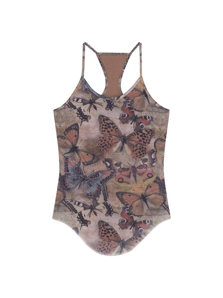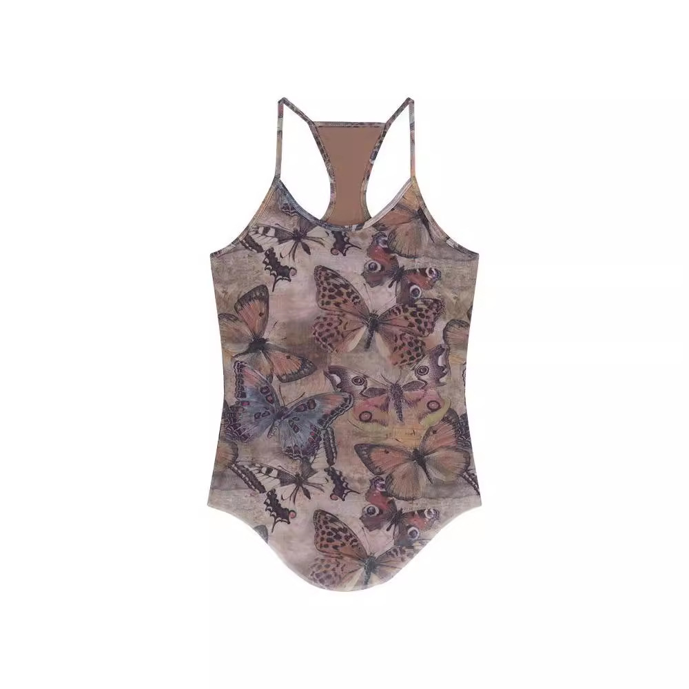 复古蝴蝶印花工字吊带背心女夏季美式辣妹修身不规则无袖上衣外穿