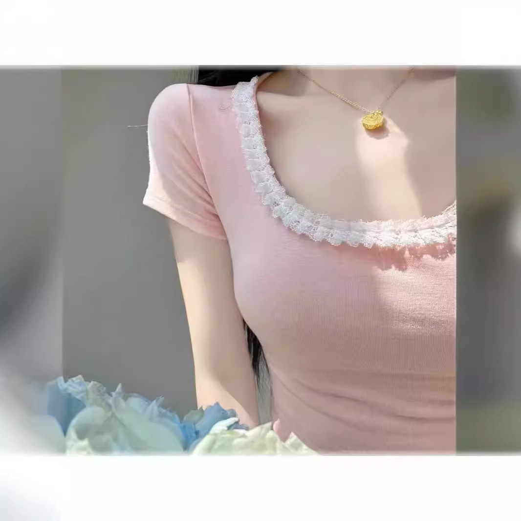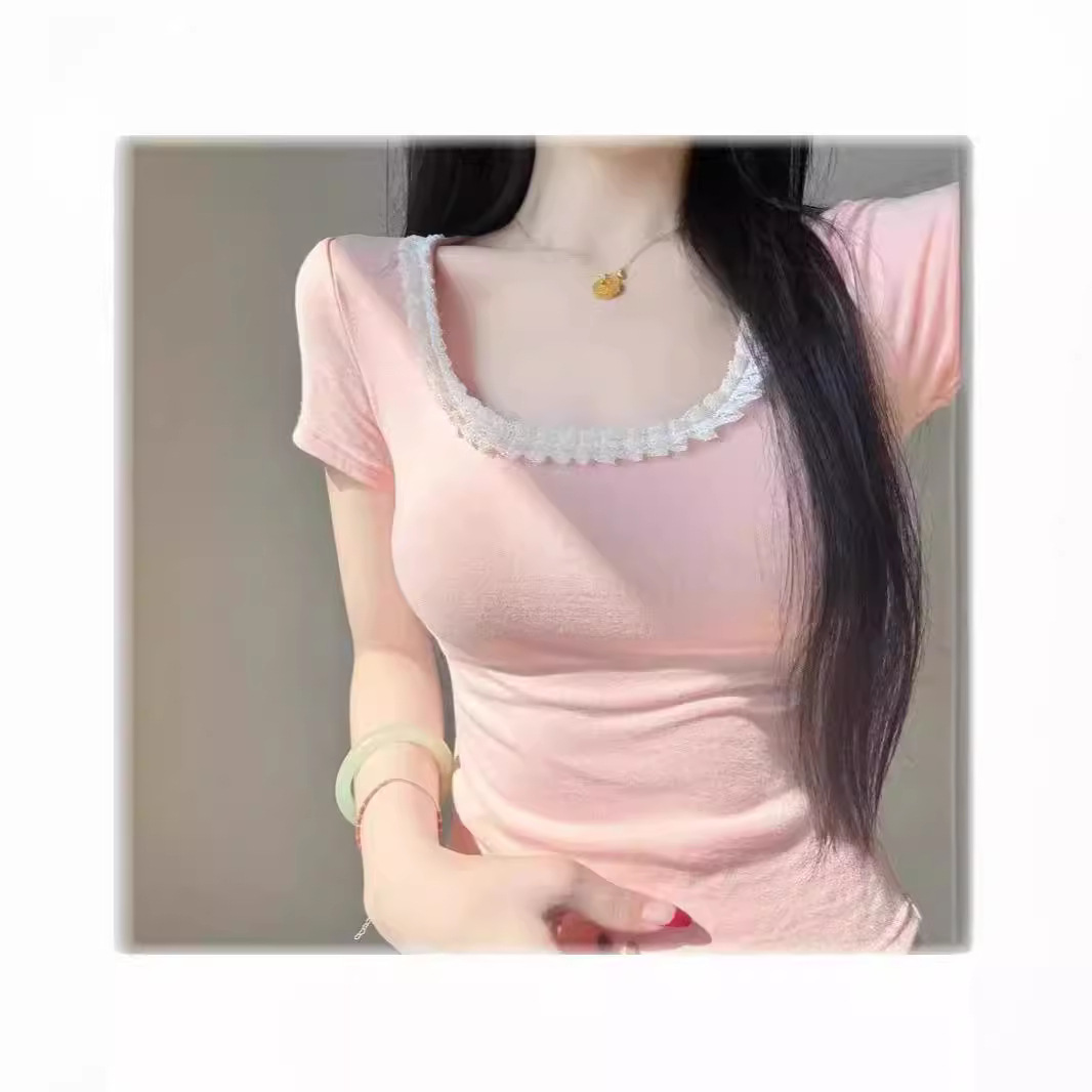 纯欲蕾丝方领短袖t恤女夏季新款茶艺紧身上衣