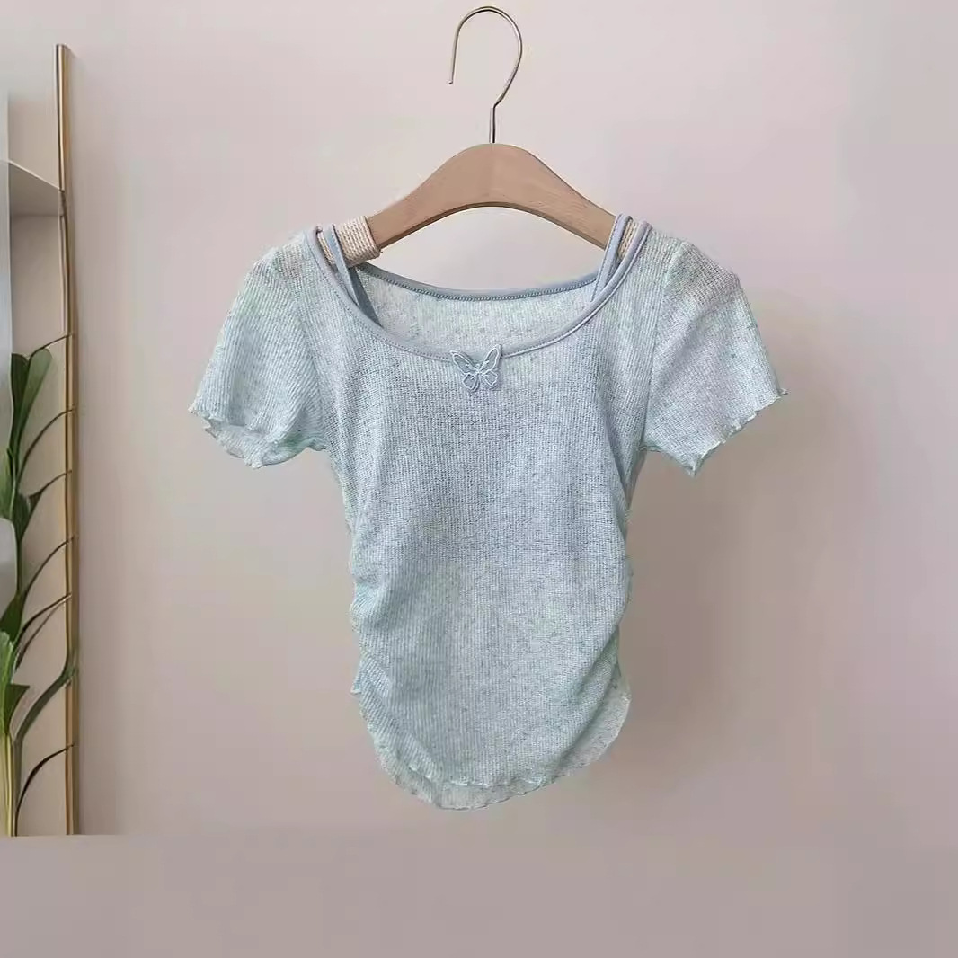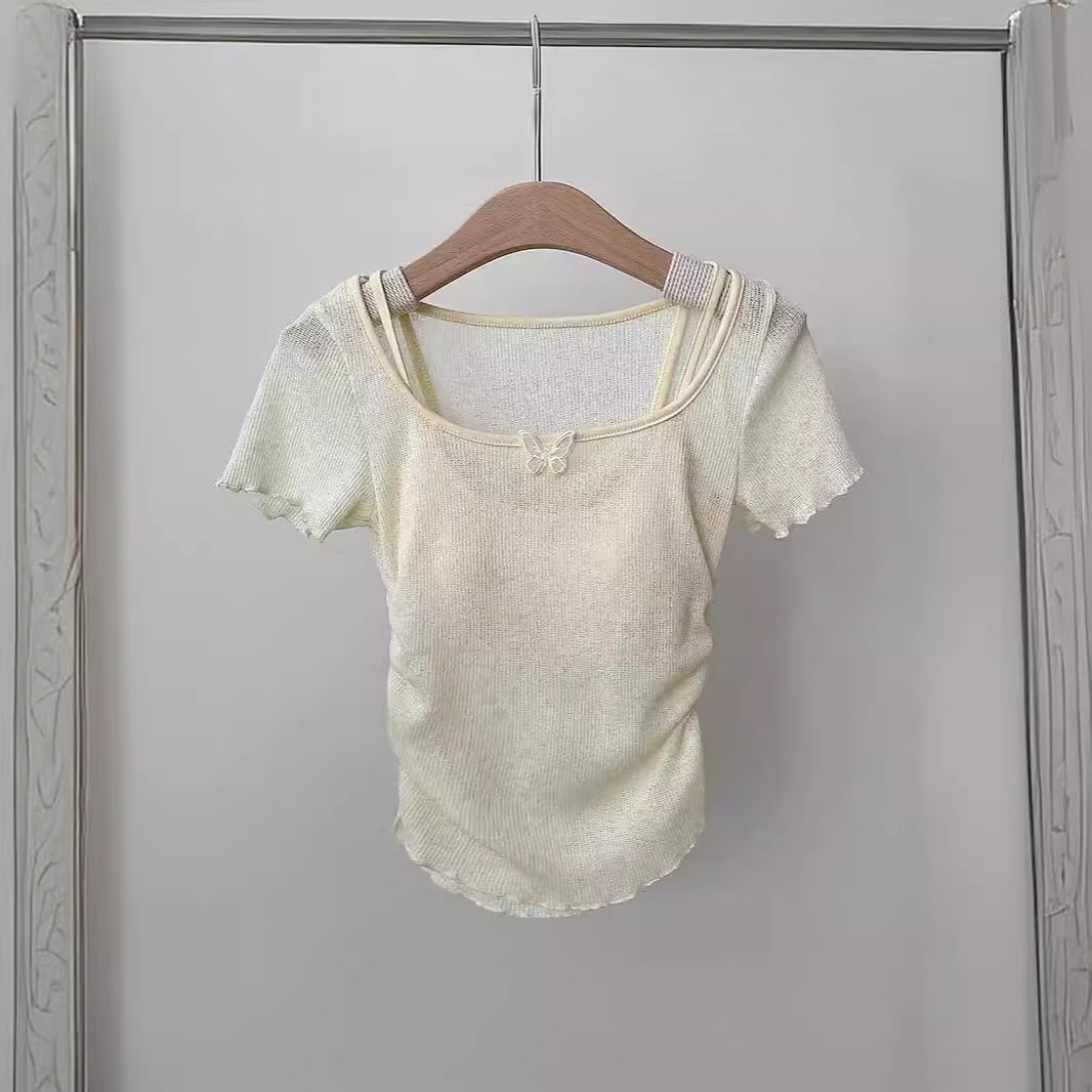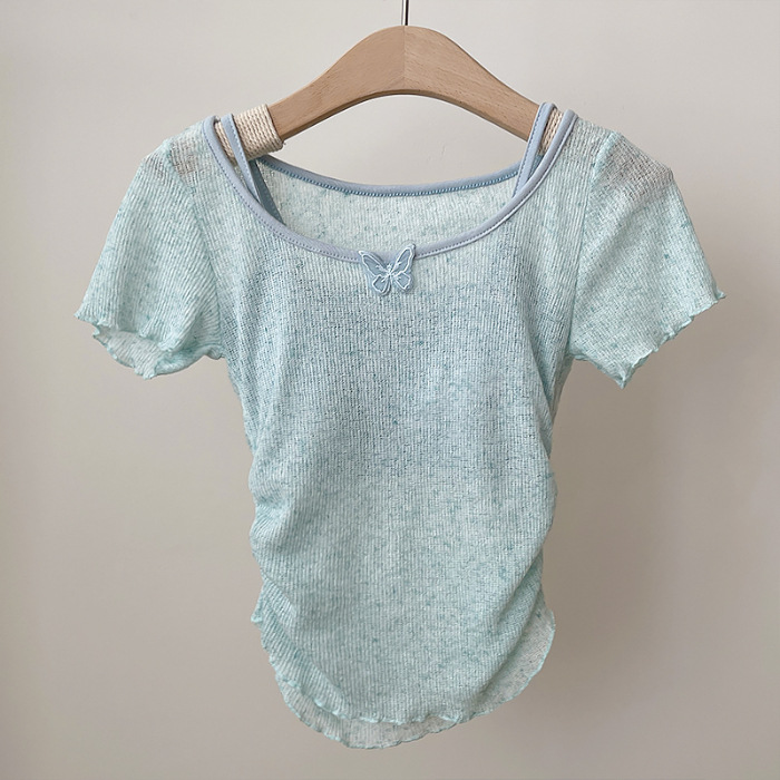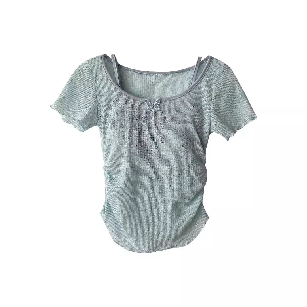 纯欲薄款微透蓝色短袖T恤女夏季带胸垫吊带小背心上衣叠穿两件套