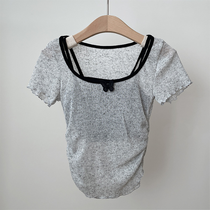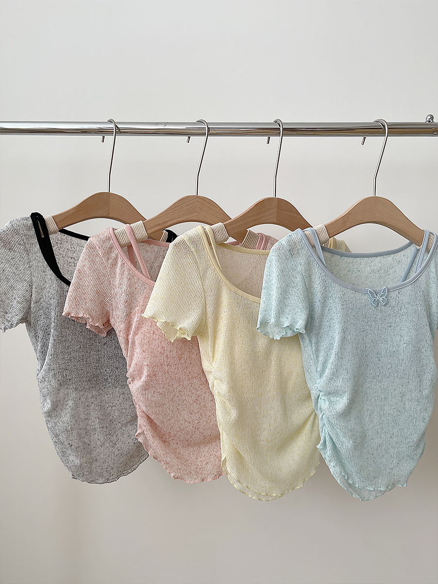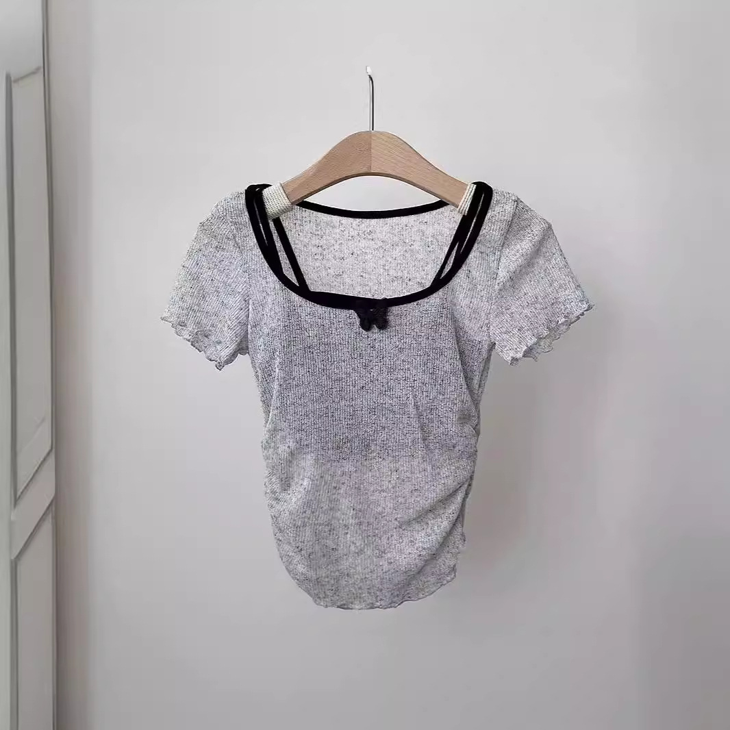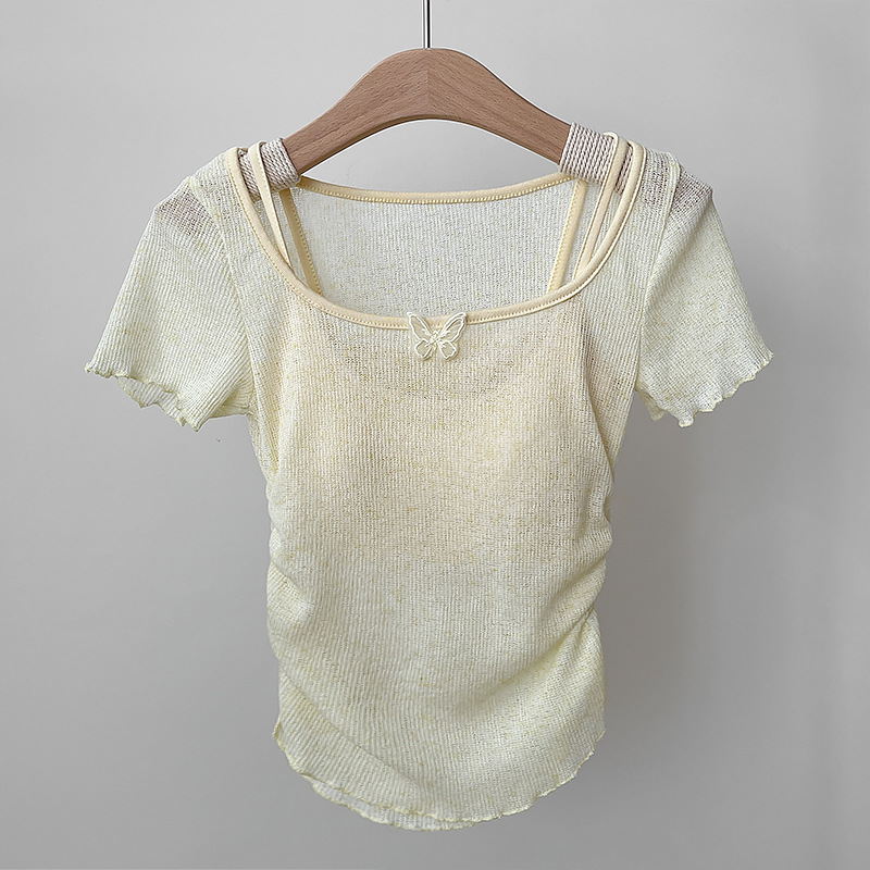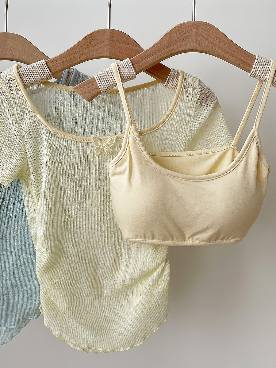 纯欲薄款微透蓝色短袖T恤女夏季带胸垫吊带小背心上衣叠穿两件套