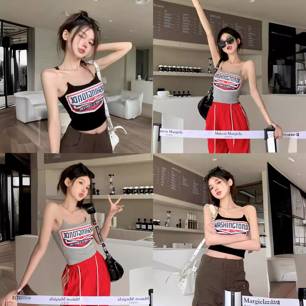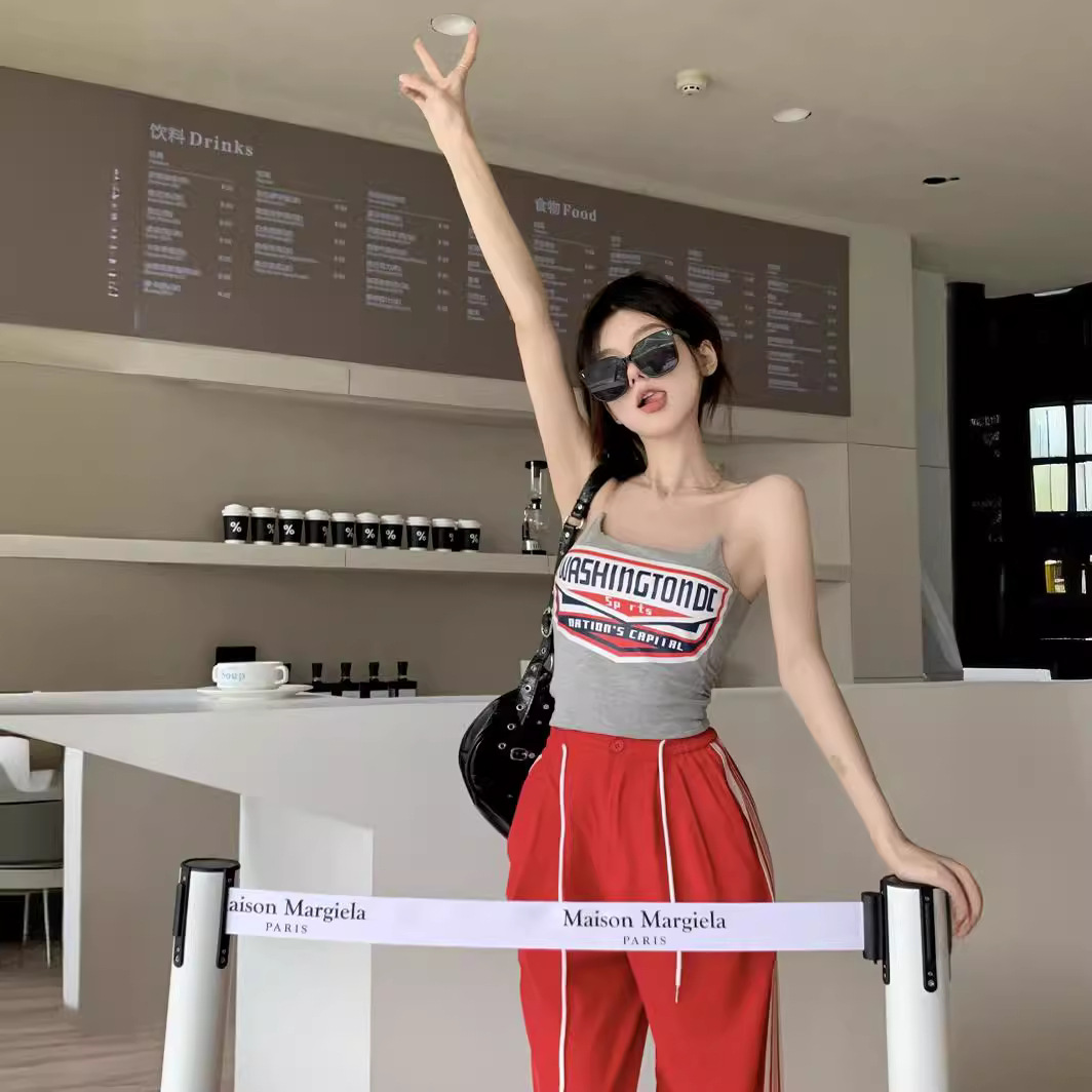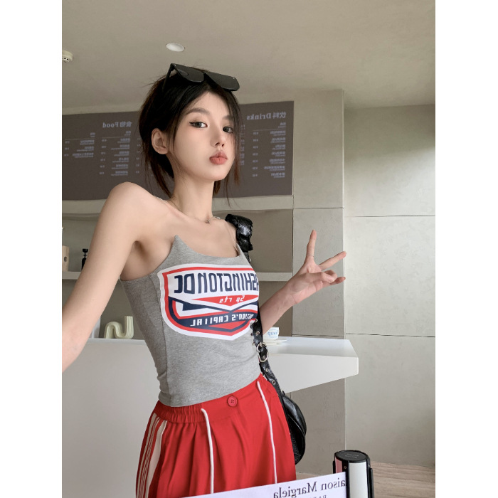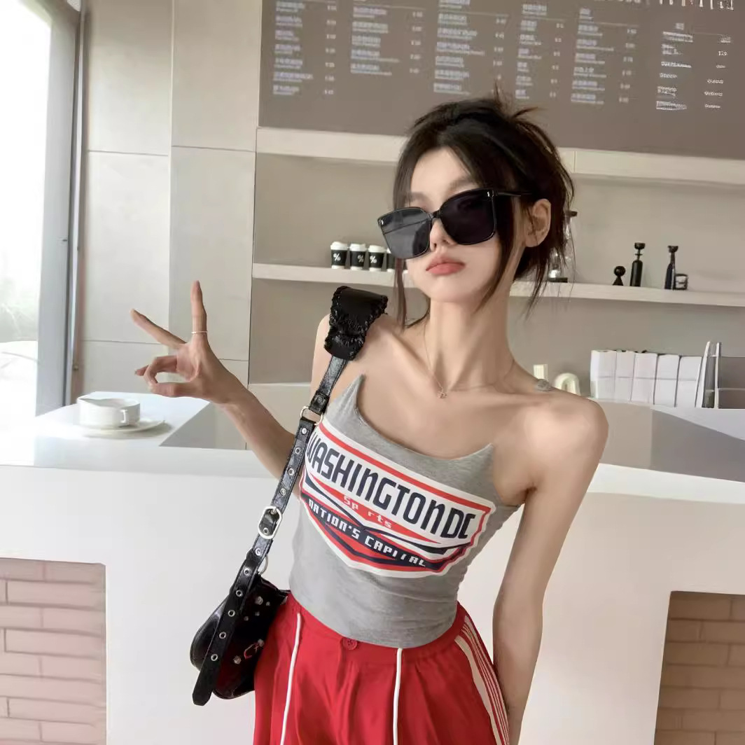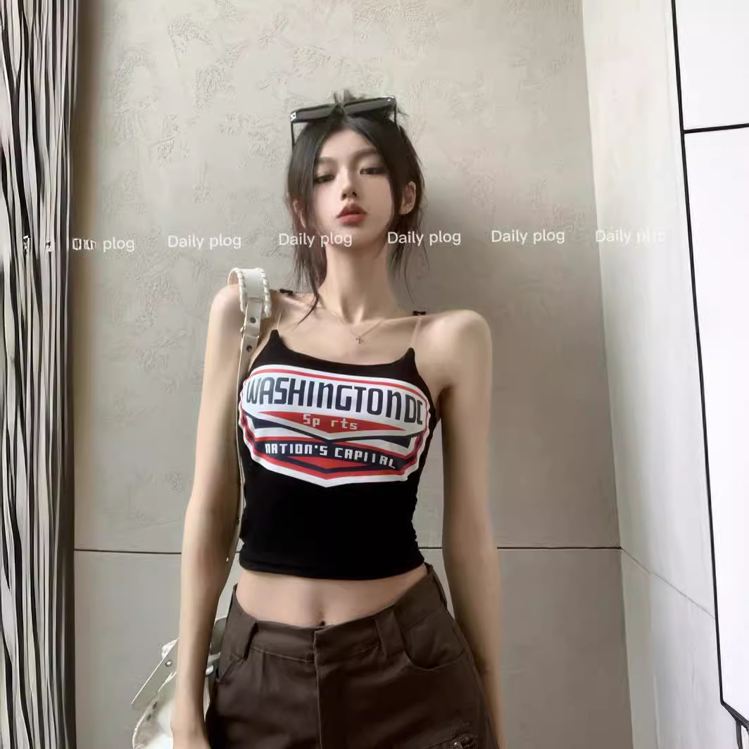 美式辣妹小吊带背心女夏季显瘦带胸垫短款印花无袖紧身上衣可外穿