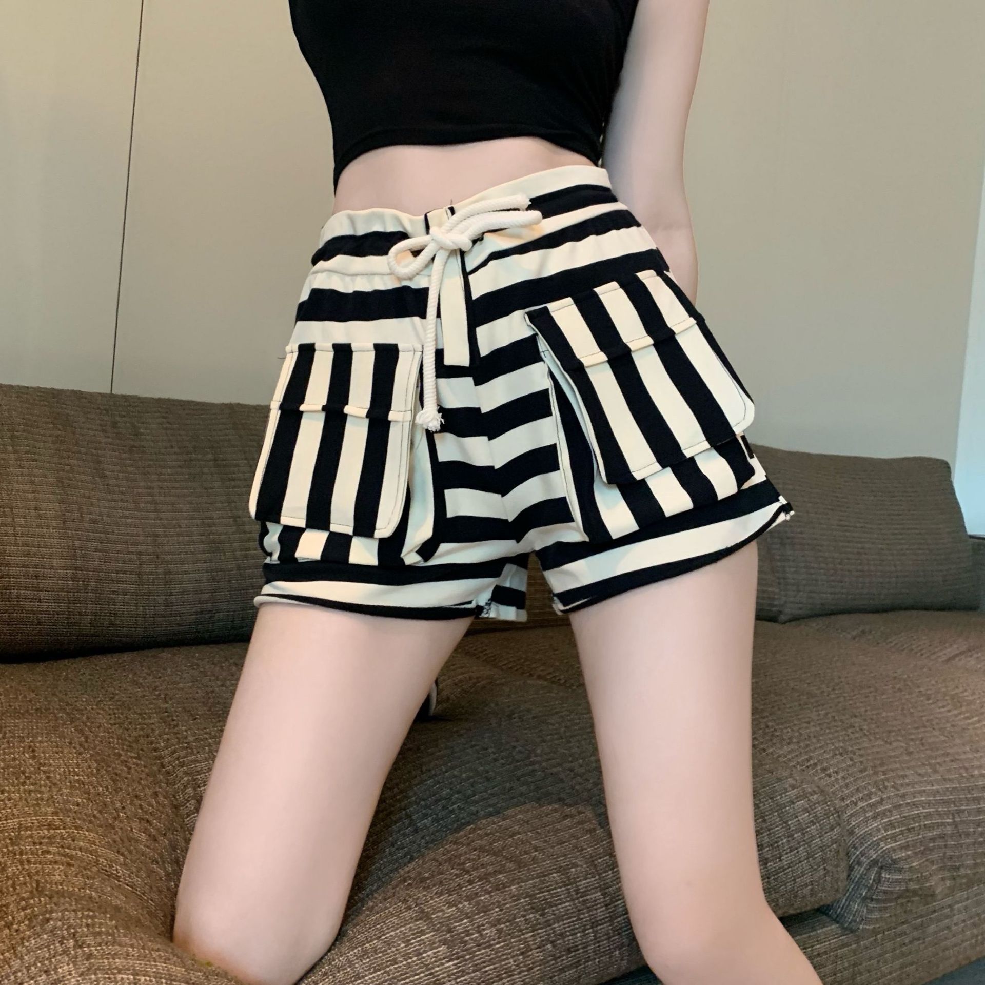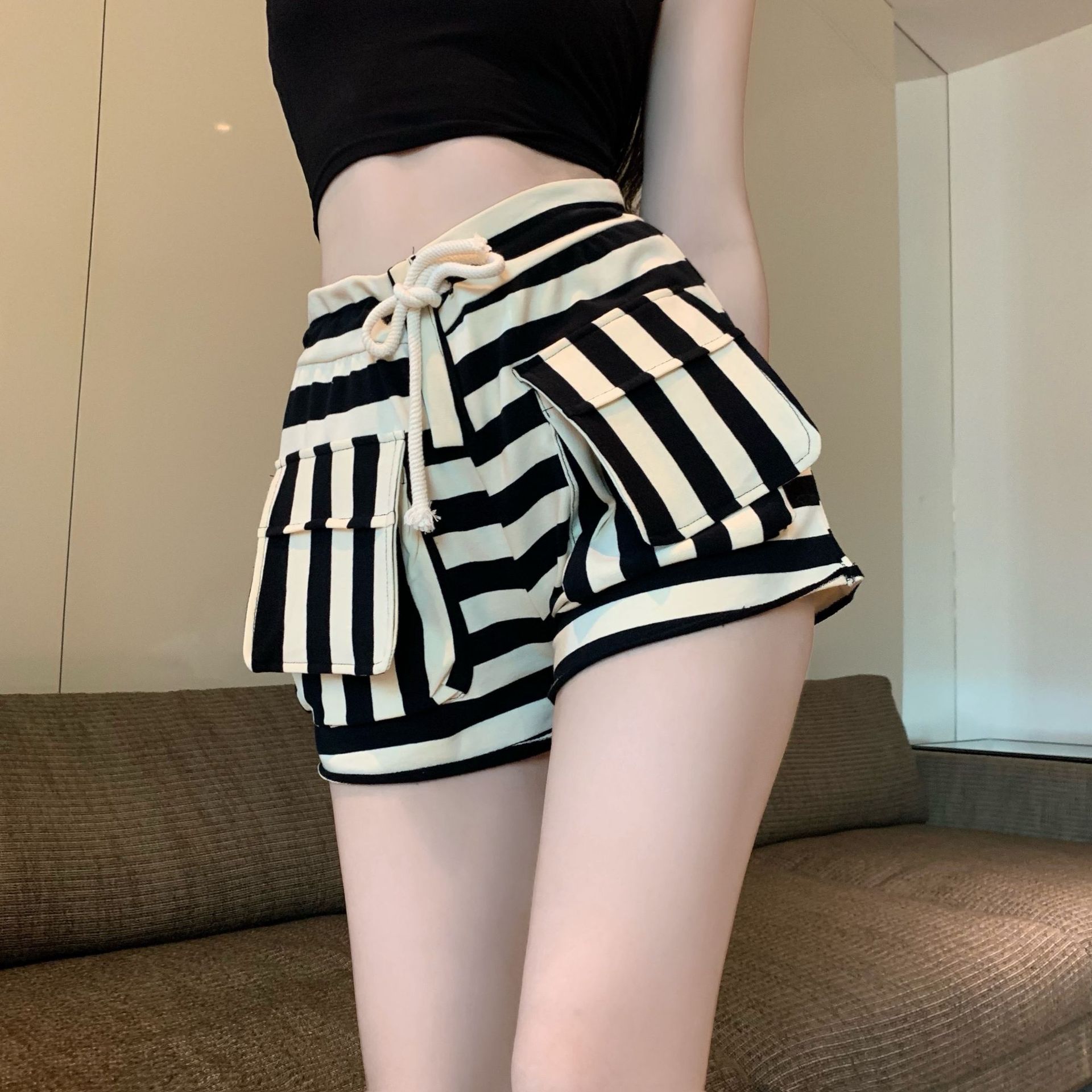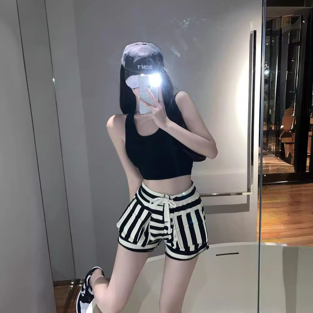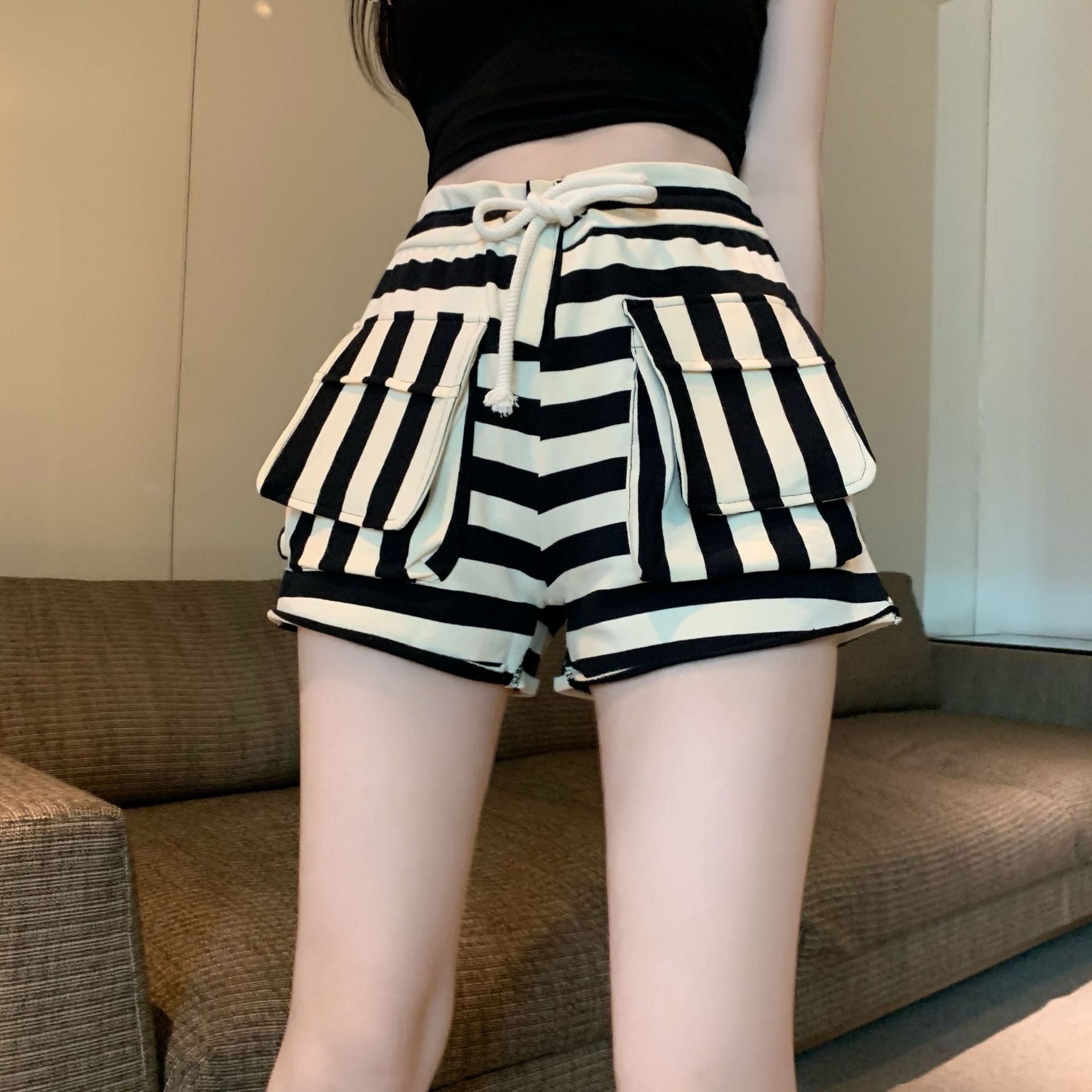 设计感条纹短款女夏季ins潮高腰显瘦阔腿裤子百搭运动休闲a字热裤