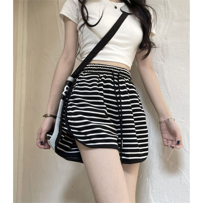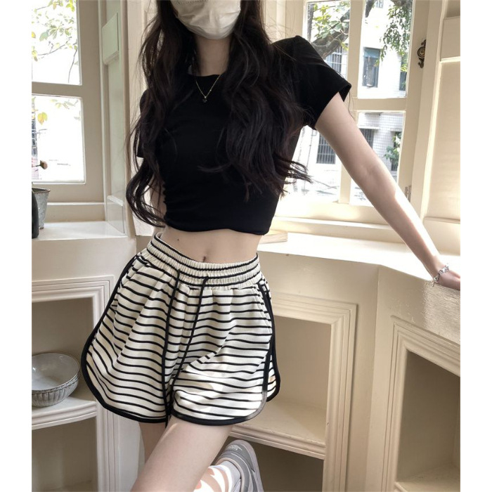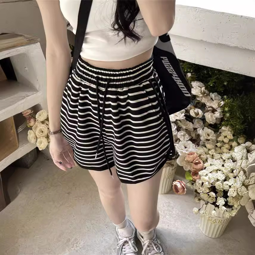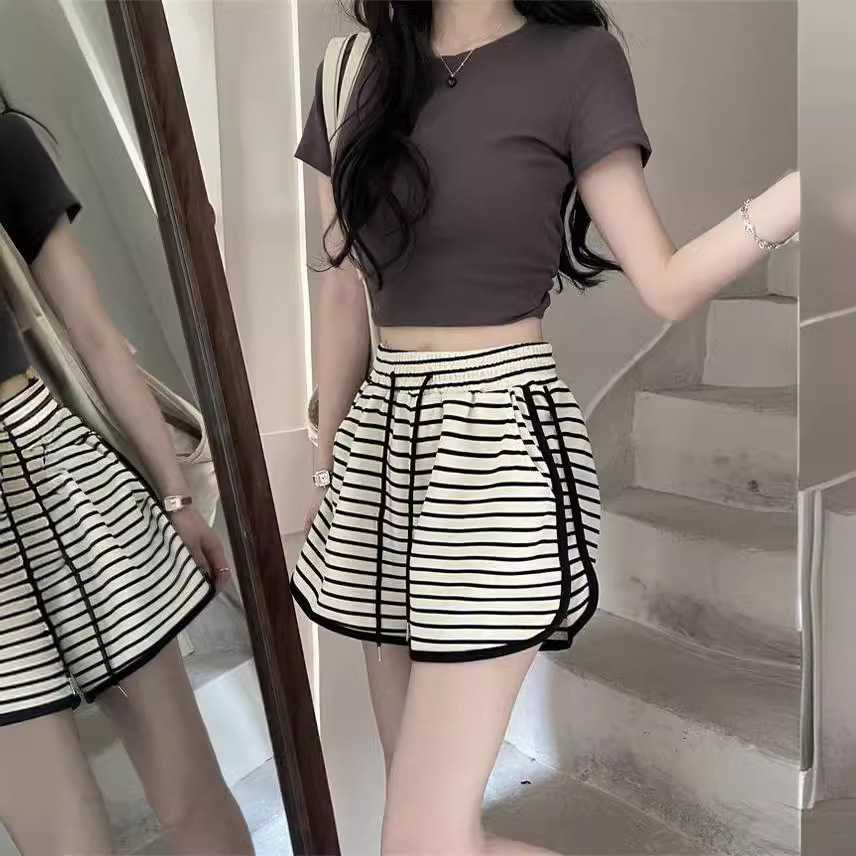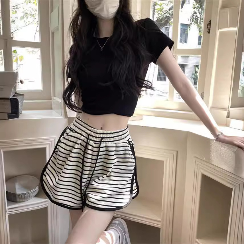 条纹高腰运动裤女短裤宽松阔腿裤夏休闲显瘦热裤松紧腰撞色ins潮