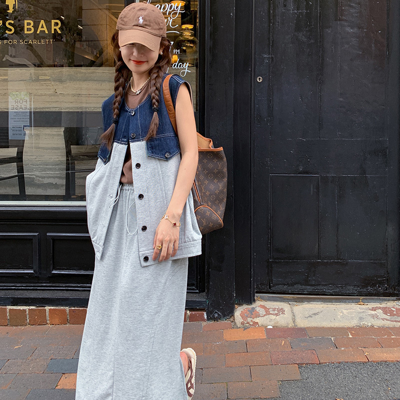 小众设计休闲时尚套装夏季新款复古牛仔拼接马甲半身裙两件套