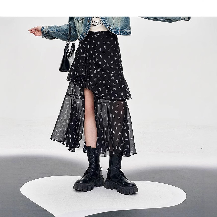 高腰开叉黑色印花半身裙女2025早春新款显瘦中长款半裙