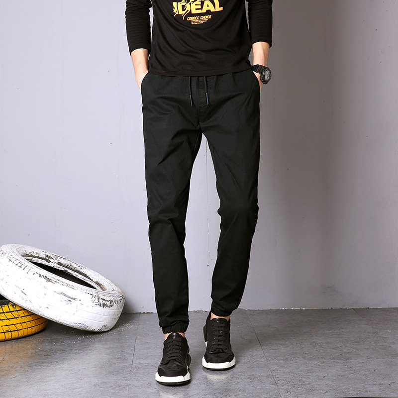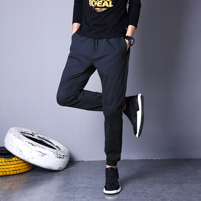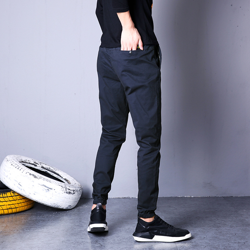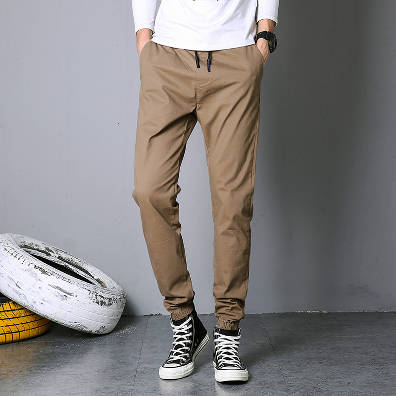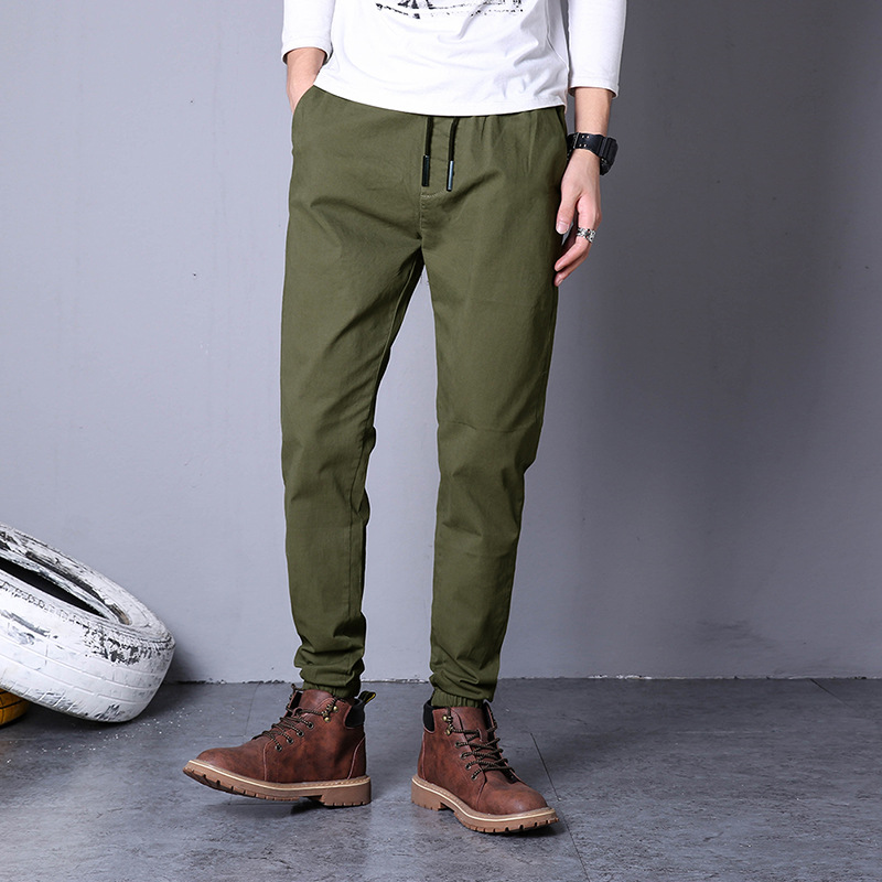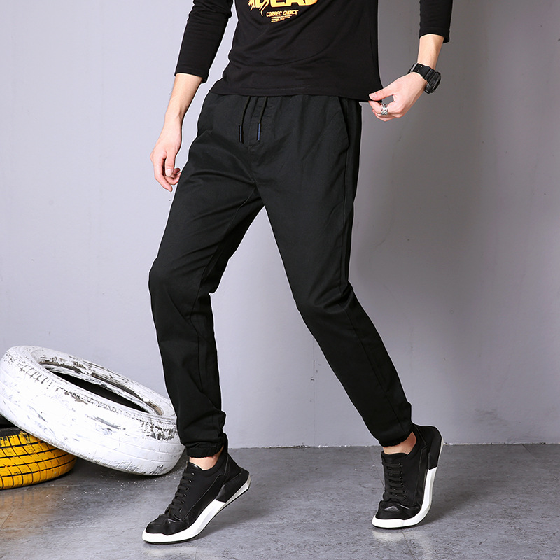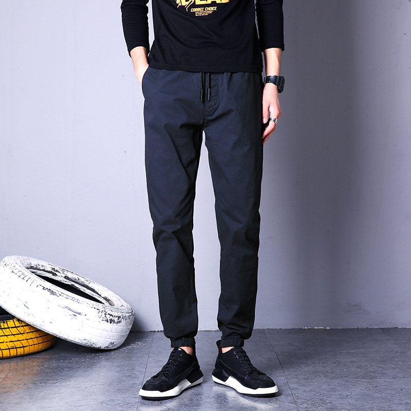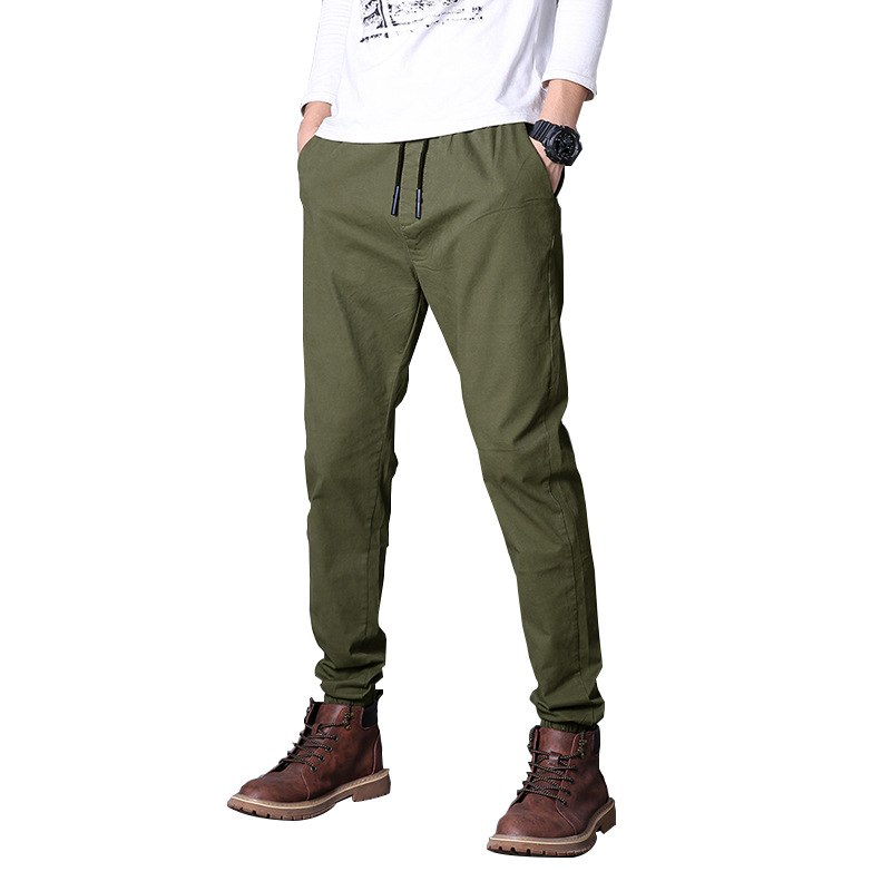 跨境新款男士休闲裤四季款 松紧腰束脚简约纯色弹力工装裤男