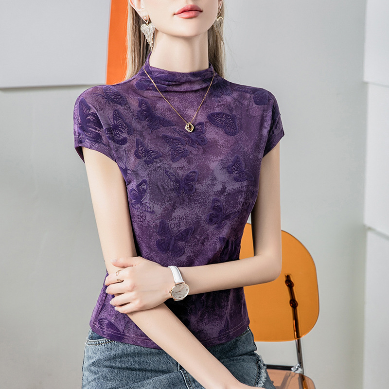 蝴蝶提花半高领网纱T恤女短袖夏季新款韩式包袖女装薄款小衫