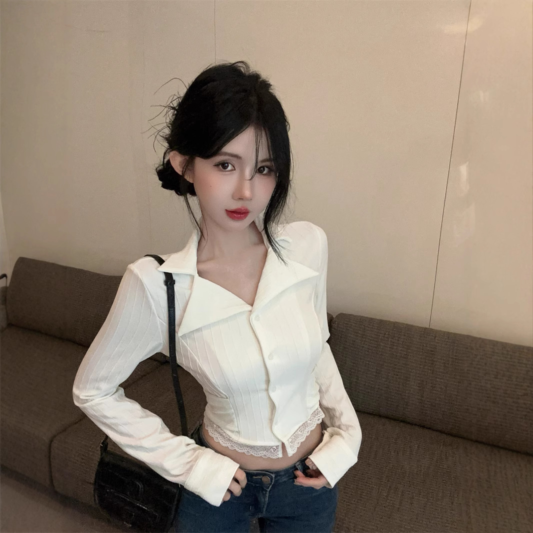 白色蕾丝花边长袖衬衫女早秋设计感小众衬衣独特别致短款法式上衣