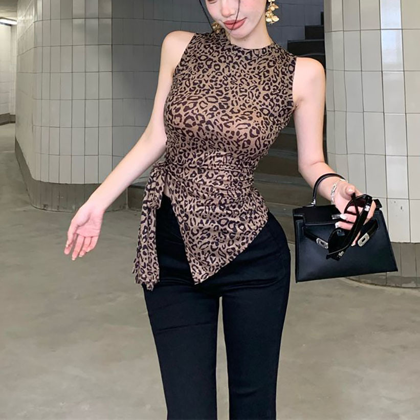 泰国东南亚复古印花豹纹吊带背心女夏季辣妹绑带不规则修身上衣