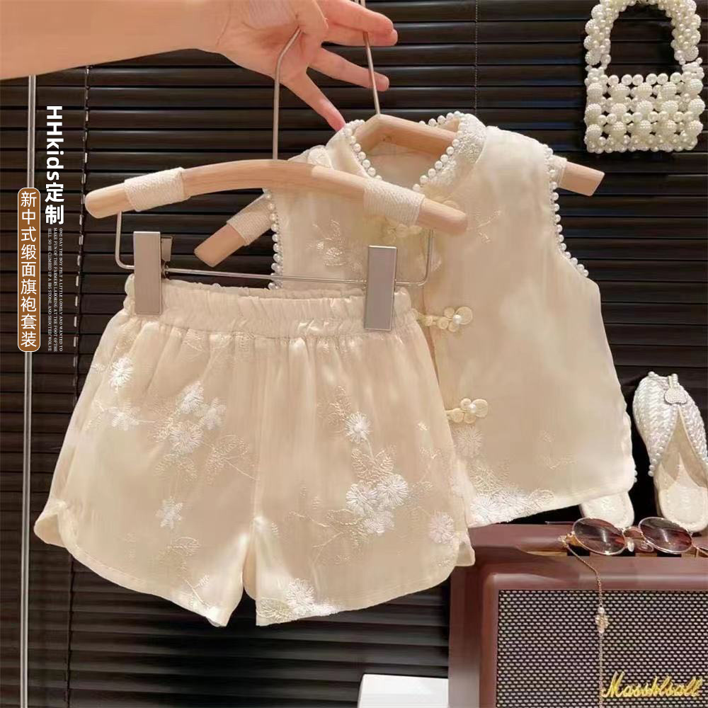新品女童套装国风钉珠斜盘扣花朵刺绣上衣短裤两件套2025夏装