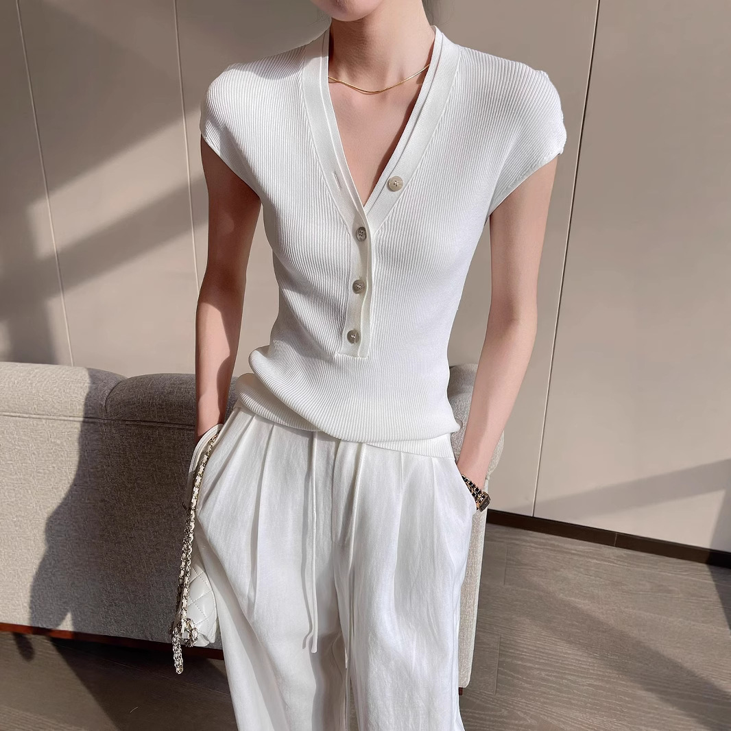 白色双层V领短袖T恤女夏季2025新款修身时尚简约气质上衣