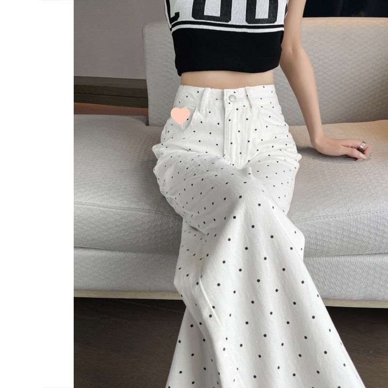 时尚波点阔腿牛仔裤女夏季薄款新款高腰宽松白色休闲直筒长裤