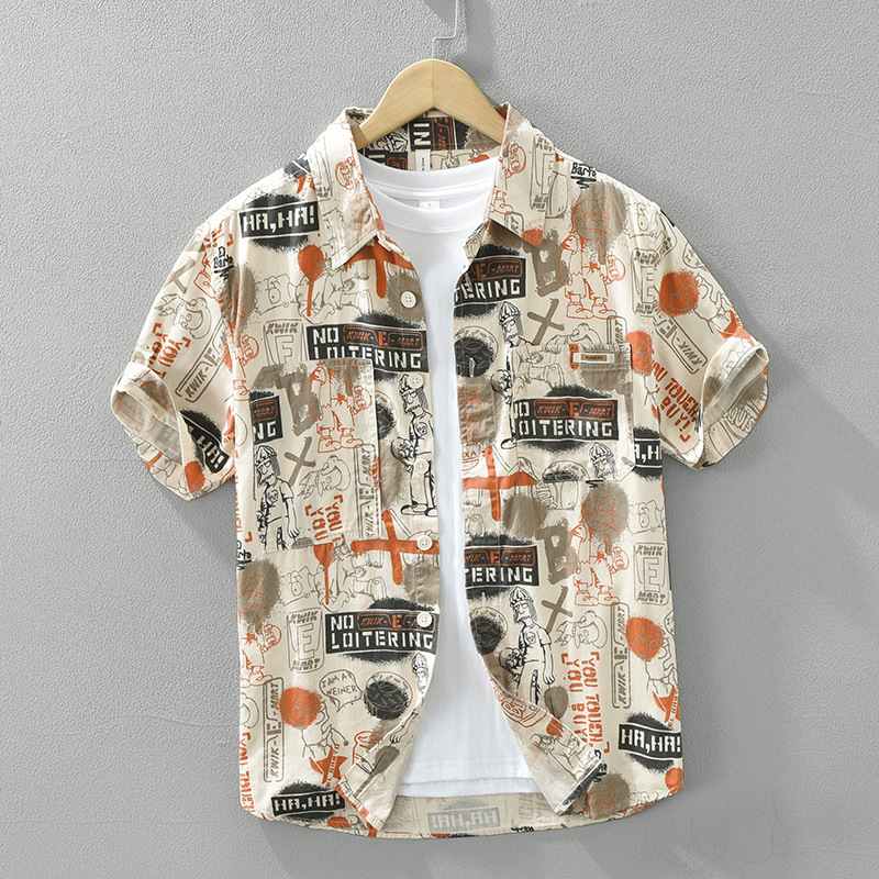 夏季日系个性印花短袖衬衫男士时尚百搭休闲文艺沙滩宽松棉直营